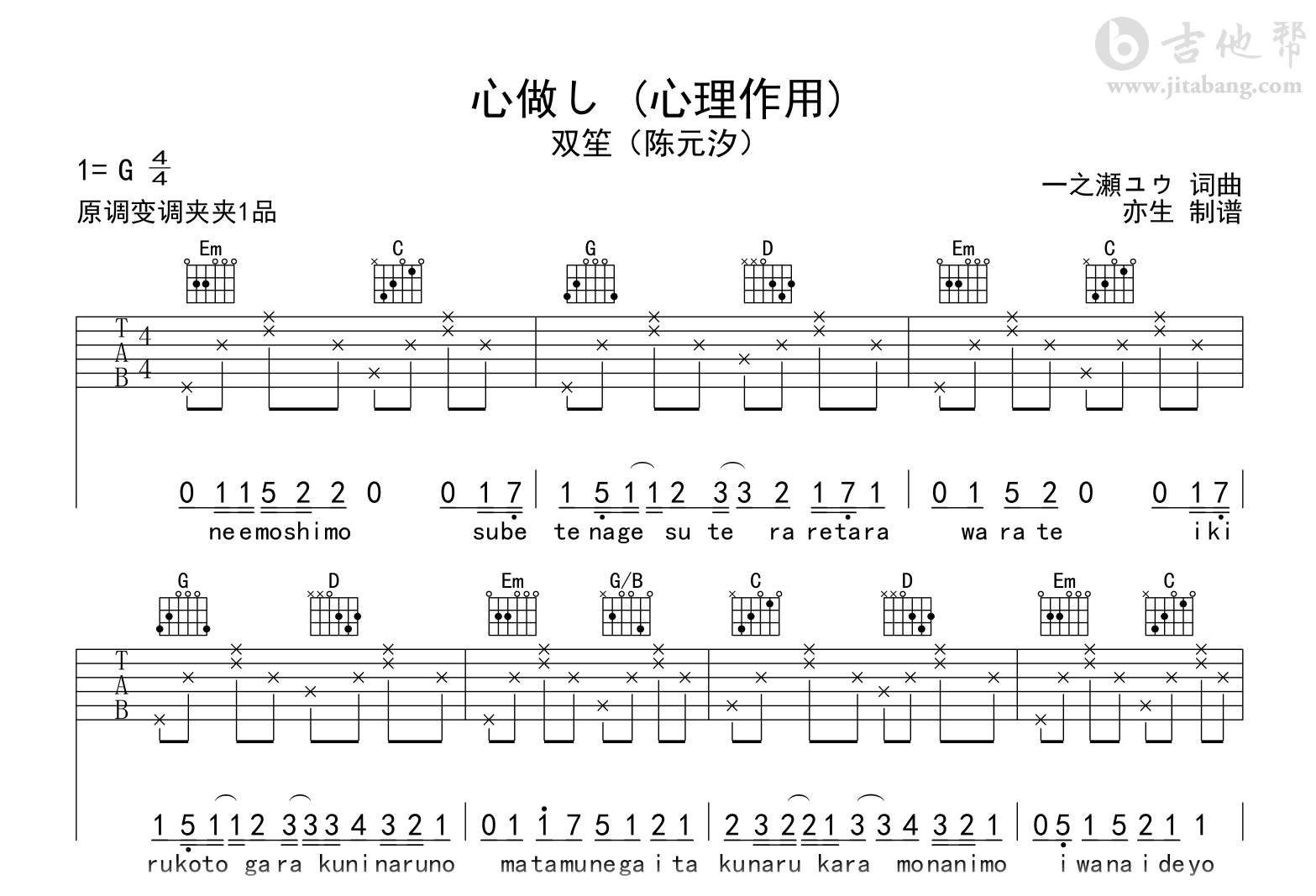 曲谱介绍: 心做し (心理作用)吉他谱,双笙演唱的一首火遍全网的日文歌曲,《心做し (心理作用)》吉他弹唱谱,采用G调和弦指法演奏,推荐变调夹夹第1品,节奏4/4拍,速度大约每分钟95拍,演奏难度为简单。 歌声中有着深情又有浓得化不开的悲伤,超级催泪!仿佛带领着自己要把感情也嘶吼出来。不开心的时候,单曲循环这个,哭着大喊出来吧。