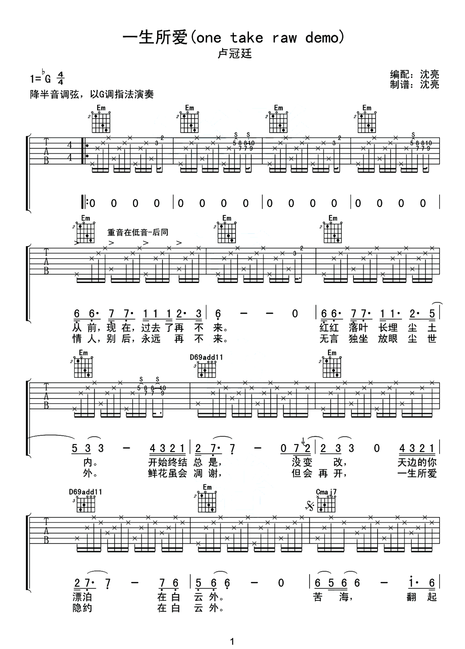 曲谱介绍: 卢冠廷《一生所爱》吉他谱,原调bG,降半音调弦,以G调指法演奏。此曲谱根据卢冠廷2015年的专辑《BeyondImaginationSACD》里其中曲目一个版本改编,《一生所爱》以交替的低音作为主要伴奏形式,非常独特。