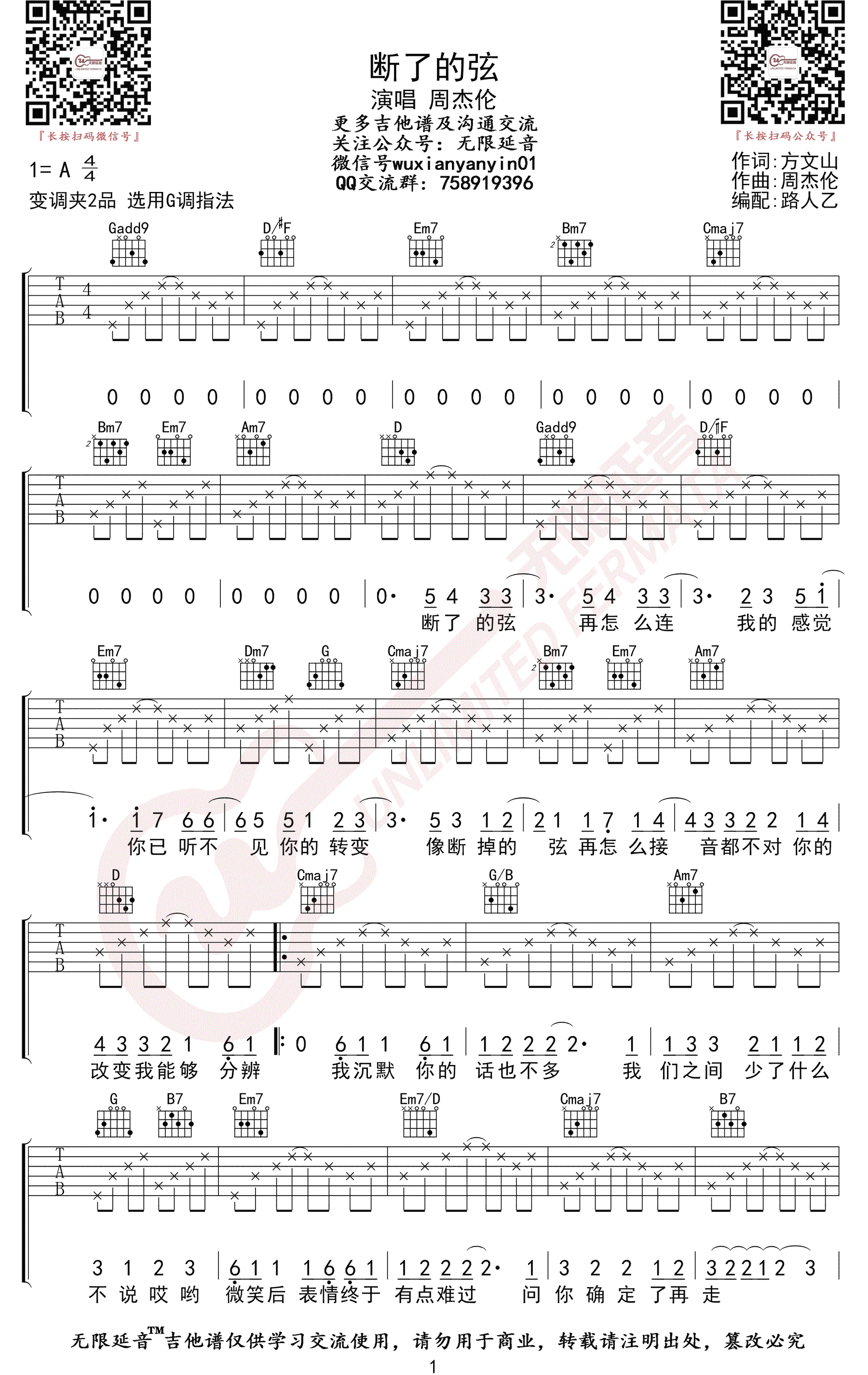 曲谱介绍: 吉他谱介绍:断了的弦吉他谱,周杰伦演唱的一首歌曲,4/4拍的节奏,这首歌曲的原调为A调,这里曲谱采用了G调指法进行编配,演唱时夹变调夹2品可回到原调,也可根据个人实际嗓音情况选择。曲谱由琴谱网更新上传,共3张高清图片弹唱吉他谱例,来源于@无限延音编配出品。这首歌是周杰伦制作的专辑《寻找周杰伦》中的主题曲,清新小品曲风,说明失去相爱的感觉,就像断掉的弦,弹不出优美的旋律,唯有相爱的两个人,才能有最美的音色。