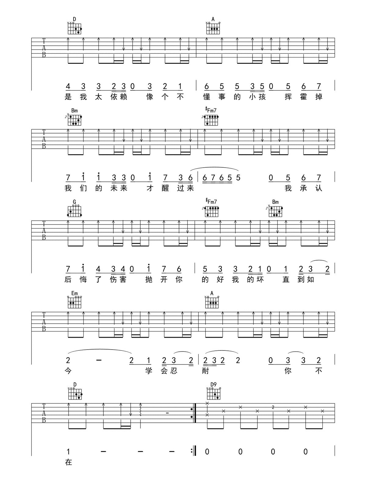 曲谱介绍: 不在吉他谱_韩安旭_《不在》D调弹唱六线谱_高清图片谱分享,《不在》是由韩安旭演唱的一首歌曲,有一些歌的歌词,真的会直击你的心灵,仿佛就是历历在目,发生在你的眼前。有时候你也会很惊讶,为什么歌里面的歌词跟你这么像,仿佛你就是歌中人。这首《不在》就是这样一首歌,在听这首歌的时候,就像是在听自己的故事一般,而那个歌中人就是自己,有种感同身受的感觉。
