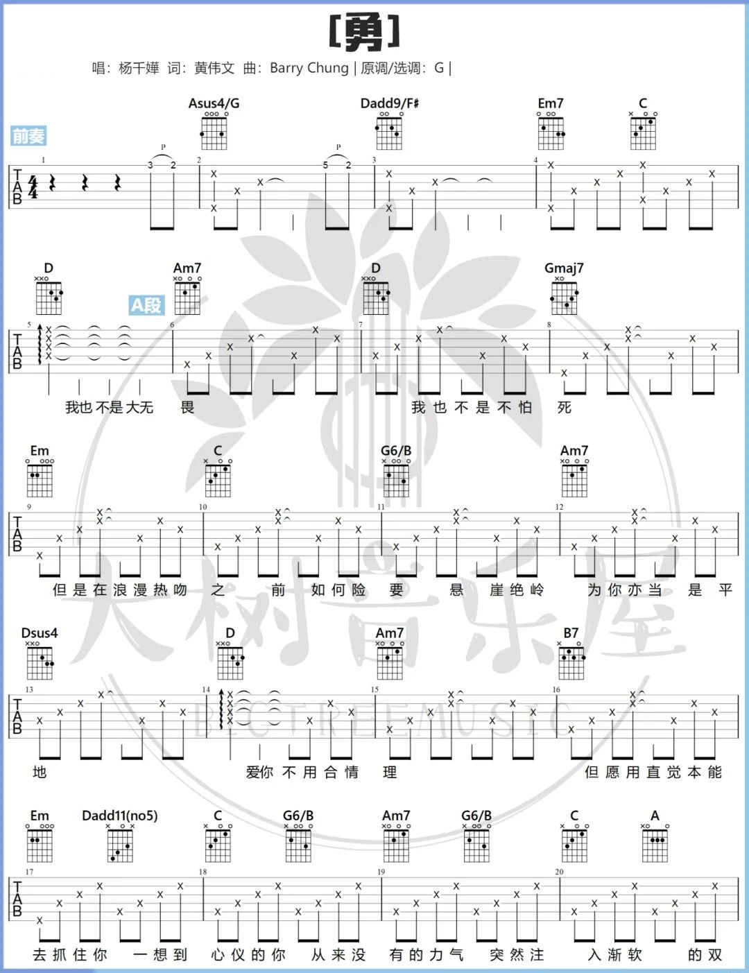 曲谱介绍: 勇吉他谱_杨千嬅_《勇》G调原版弹唱六线谱_高清图片谱分享,《勇》是由杨千嬅演唱的一首粤语歌曲,在爱情中,总会有那么一个人是”勇且无畏“的,这首歌曲旋律委婉动听,感情真切。这首歌描述的是女主人公为爱英勇的故事,就像不倒翁一样,倒下去,再起来继续英勇。很多人都是缺乏爱一个人的英勇,希望那些犹豫的、忐忑的、渴望爱的,全部英勇地去爱。