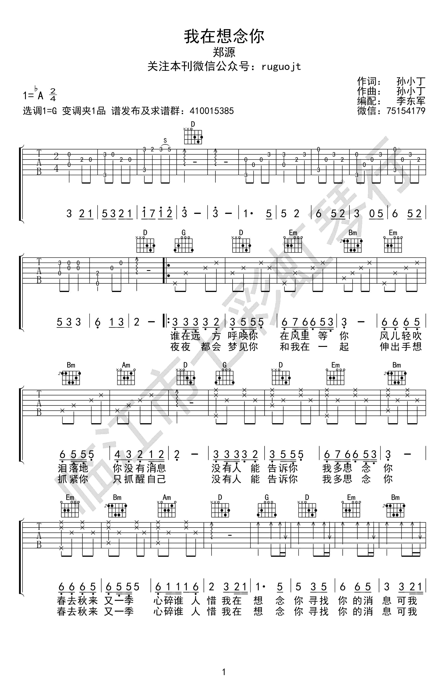 我在想念你吉他谱 - 郑源 - G调吉他弹唱谱