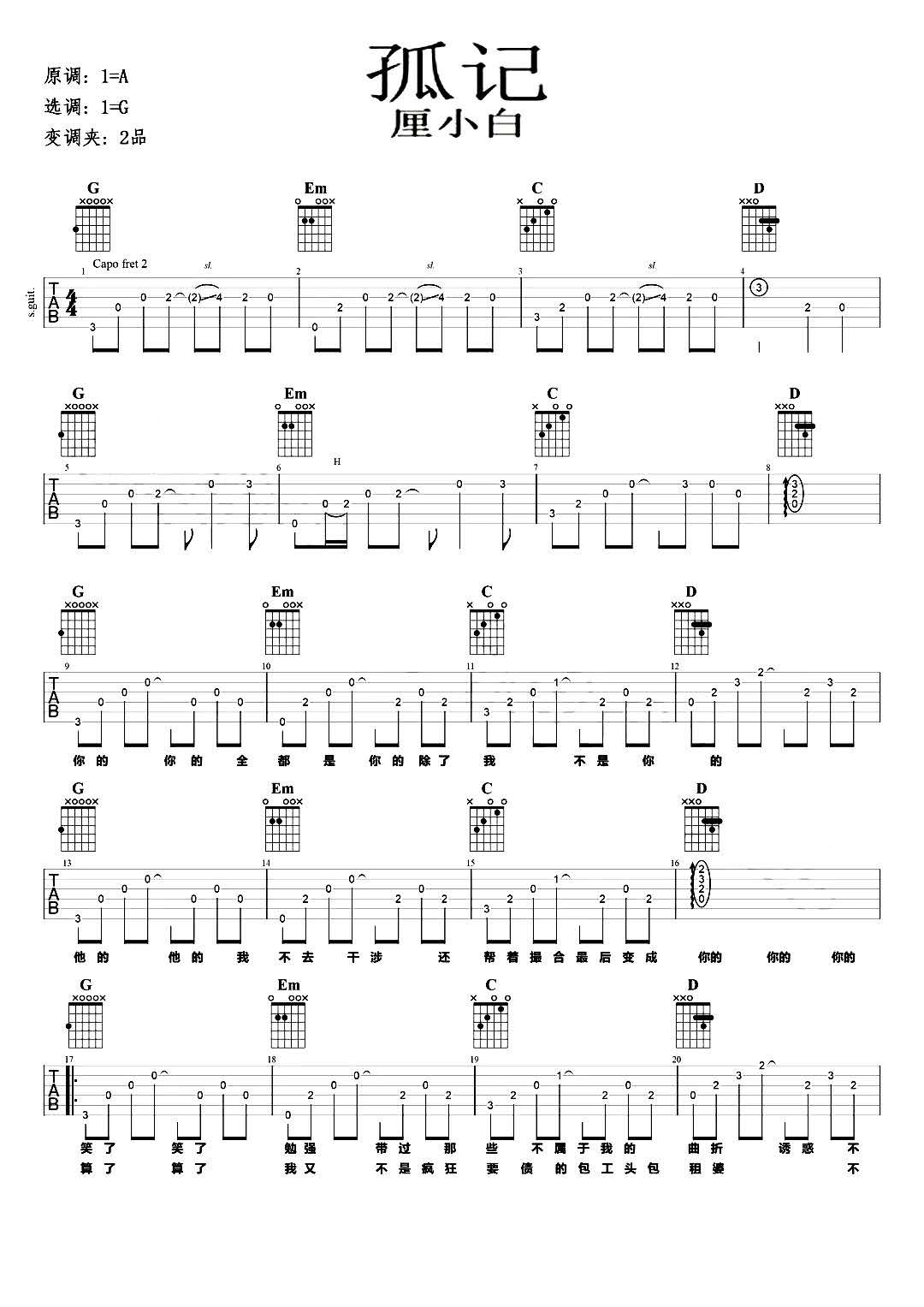 孤记吉他谱 - 厘小白 - G调吉他弹唱谱 - 原版