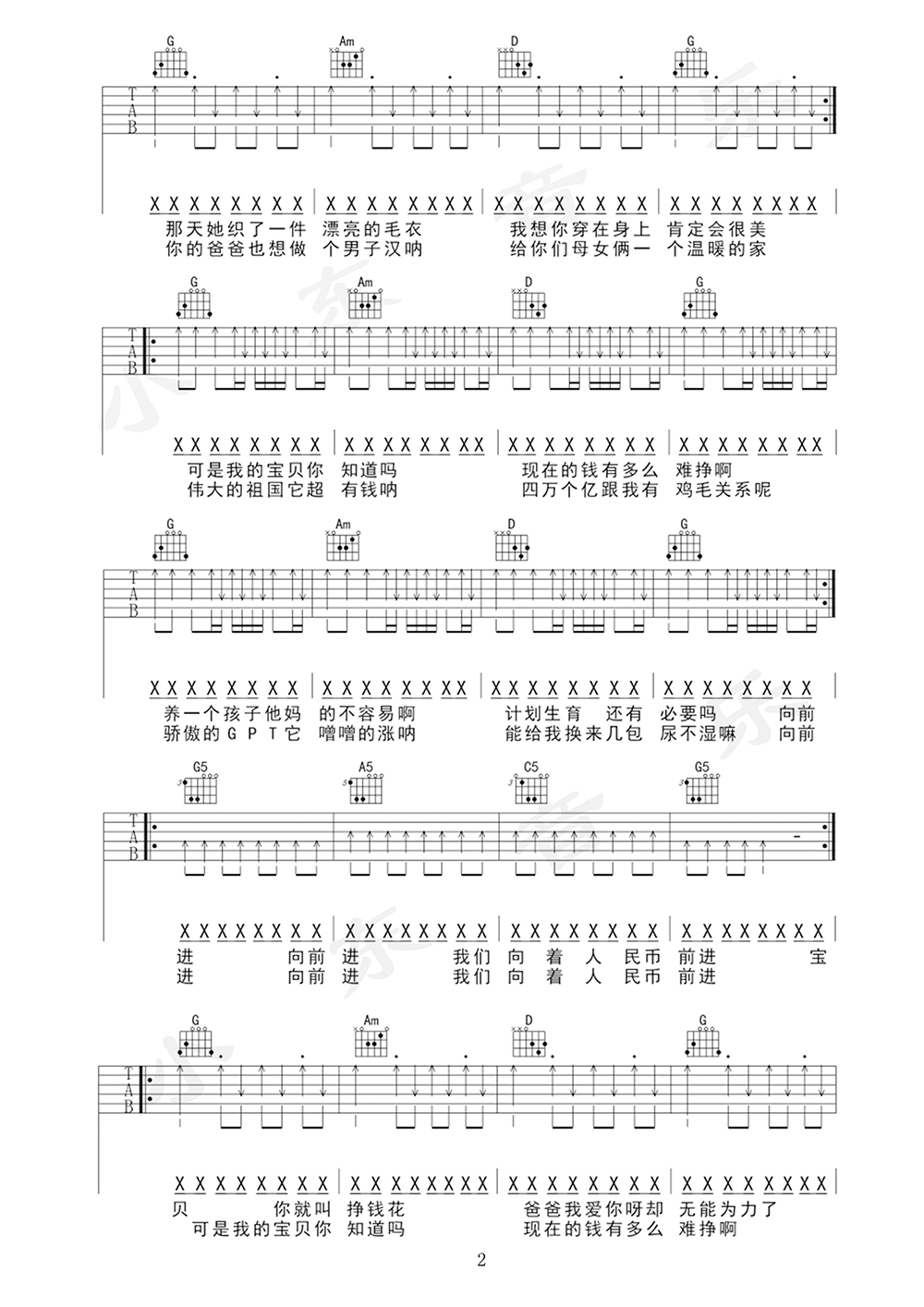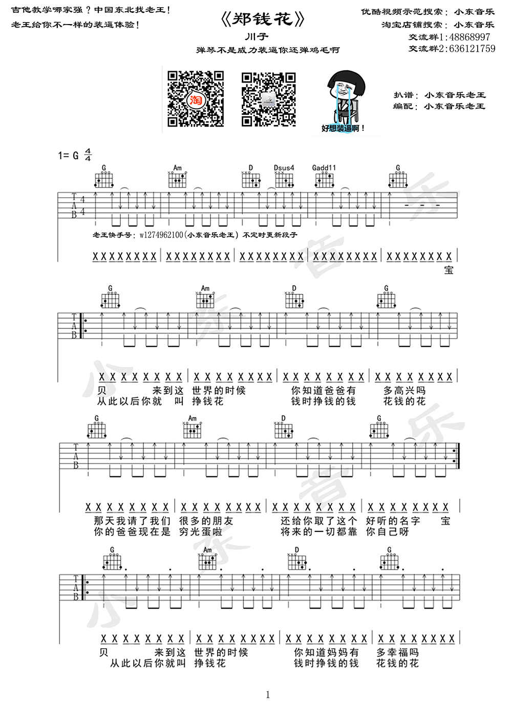 曲谱介绍: 郑钱花吉他谱_川子_《郑钱花》G调弹唱六线谱_高清图片谱分享,《郑钱花》是由川子创作并演唱的一首歌,很多人觉得在这首歌那简单旋律与平白歌词里能够找到生活的影子,引起广大听众的广泛共鸣。歌曲无论在旋律与歌词上都比较直接,甚至可能有点粗鲁,但却是一种看得见摸得着的赤裸的真实,那粗犷沧桑的声音唱出多少孩奴无奈的心声。
