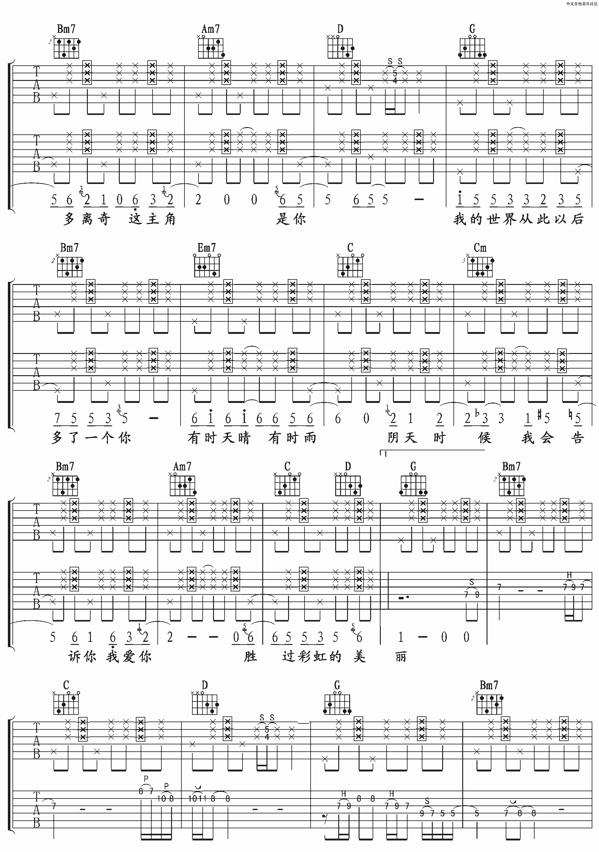 曲谱介绍: 彩虹吉他谱_羽泉_《彩虹》G调双吉他版弹唱六线谱_高清图片谱分享,《彩虹》是由陈羽凡作词作曲,羽泉组合演唱的一首歌,周杰伦有一首歌叫做《彩虹》,是一首充满悲伤的情歌,而羽泉组合的这首歌同名歌曲《彩虹》,却是充满甜蜜爱意的,整首歌都可以看出为了心爱的人,愿意为她做一切美好的事情。羽凡高亢的嗓音加上海泉干净的声线,让这首歌具有很强的感染力,非常吸引人。