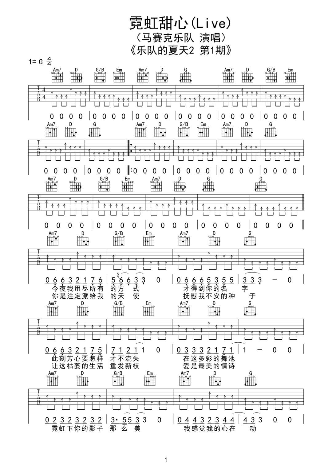 曲谱介绍: 《霓虹甜心》吉他谱_马赛克乐队_G调弹唱六线谱_高清图片谱分享,《霓虹甜心》是由马赛克乐队在《乐队的夏天2》中演唱的一首歌,歌曲运用复古的节拍,融合低保真的蒸汽波,你能从《霓虹甜心》里看到一些City Pop的影子,它亦会让你回想起马赛克过往的甜蜜之作。马赛克式情歌总是会用一种暧昧的姿态给予你多重冲击,它甜蜜而又彷徨,且原始而又纯粹,如同美好爱情般拯救你的低潮。