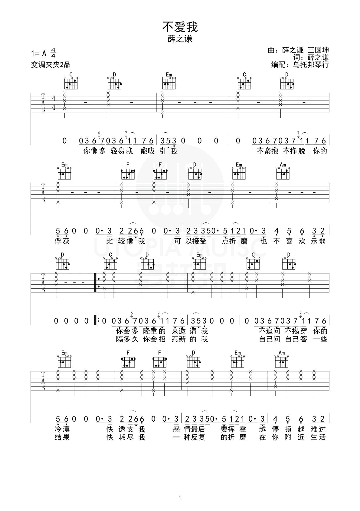 曲谱介绍: 不爱我吉他谱_薛之谦_《不爱我》G调弹唱六线谱_高清图片谱分享,《不爱我》是由薛之谦创作并演唱的一首歌,这首歌歌词以柔情裹挟内心斑驳,卑怯又执着。