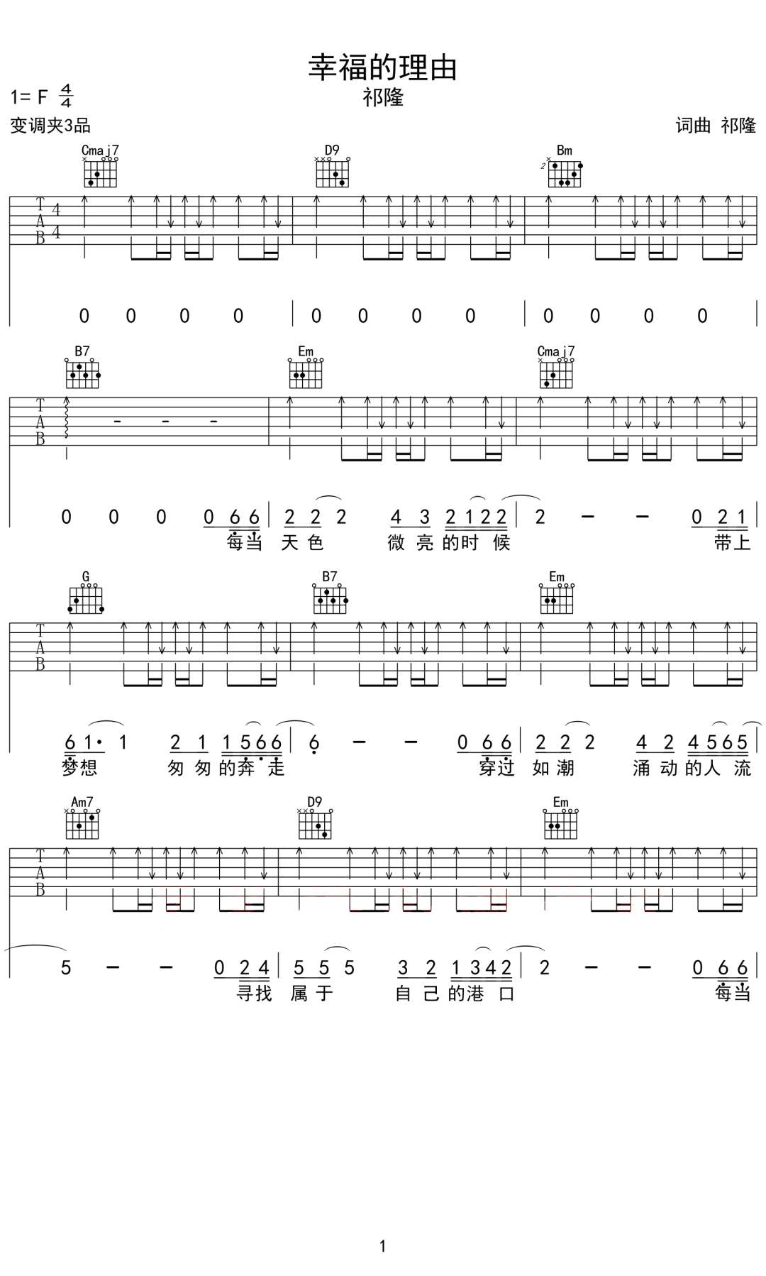 曲谱介绍: 《幸福的理由》吉他谱_祁隆_D调弹唱六线谱_高清图片谱分享,《幸福的理由》是由祁隆演唱的一首歌曲。