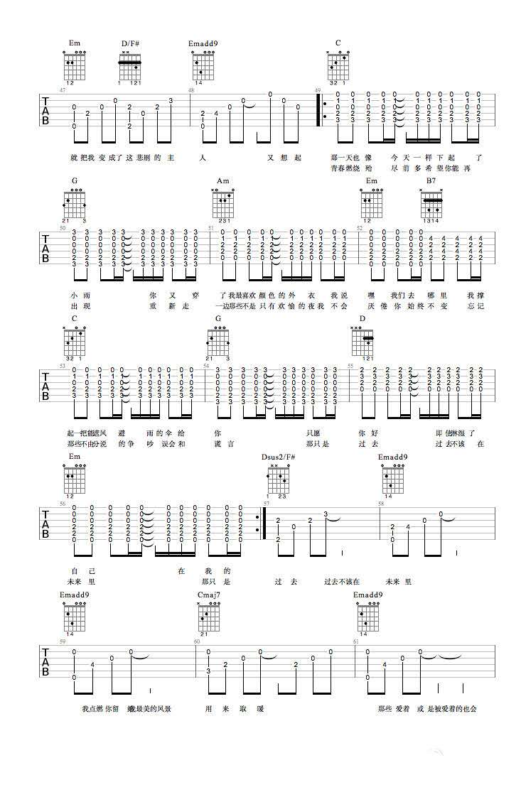曲谱介绍: 《小雨日记》吉他谱_崔跃文_G调原版弹唱六线谱_高清图片谱分享,《小雨日记》是由崔跃文演唱的一首民谣歌曲,是一首非常走心的歌,你只是迷路的人,我只是爱莫能助。我们都是渺小的人,听故事也会认真。你是个懦弱的人,也不敢和我结婚。不知道崔大帅歌里的“你”是谁,他也没有说过,因为每个人听歌的时候,心里想的只是自己内心的那个“你”。