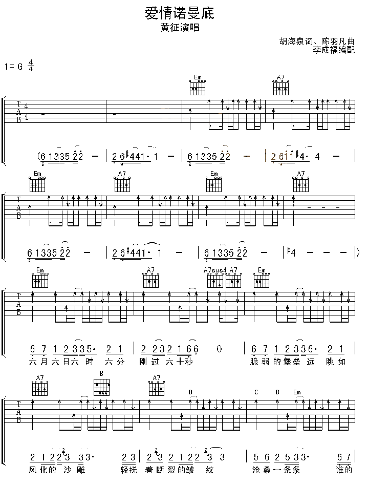 曲谱介绍: 《爱情诺曼底》吉他谱_黄征_G调弹唱六线谱_高清图片谱分享,《爱情诺曼底》是由胡海泉作词,陈羽凡作曲,黄征演唱的歌曲,爱情诺曼底将爱情比作一场战争,向对方展开强大的爱情攻势被比作诺曼底登陆这场著名的海上登陆作战。歌曲讲述爱情如登陆诺曼底战役般艰难且伟大,于每年六月六日广为传唱,成为情侣之间定情之曲。