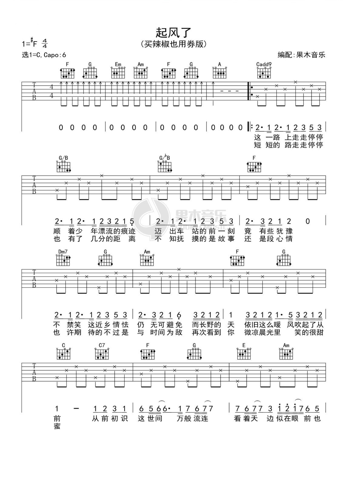 曲谱介绍: 买辣椒也用券《起风了》吉他谱_C调吉他弹唱谱