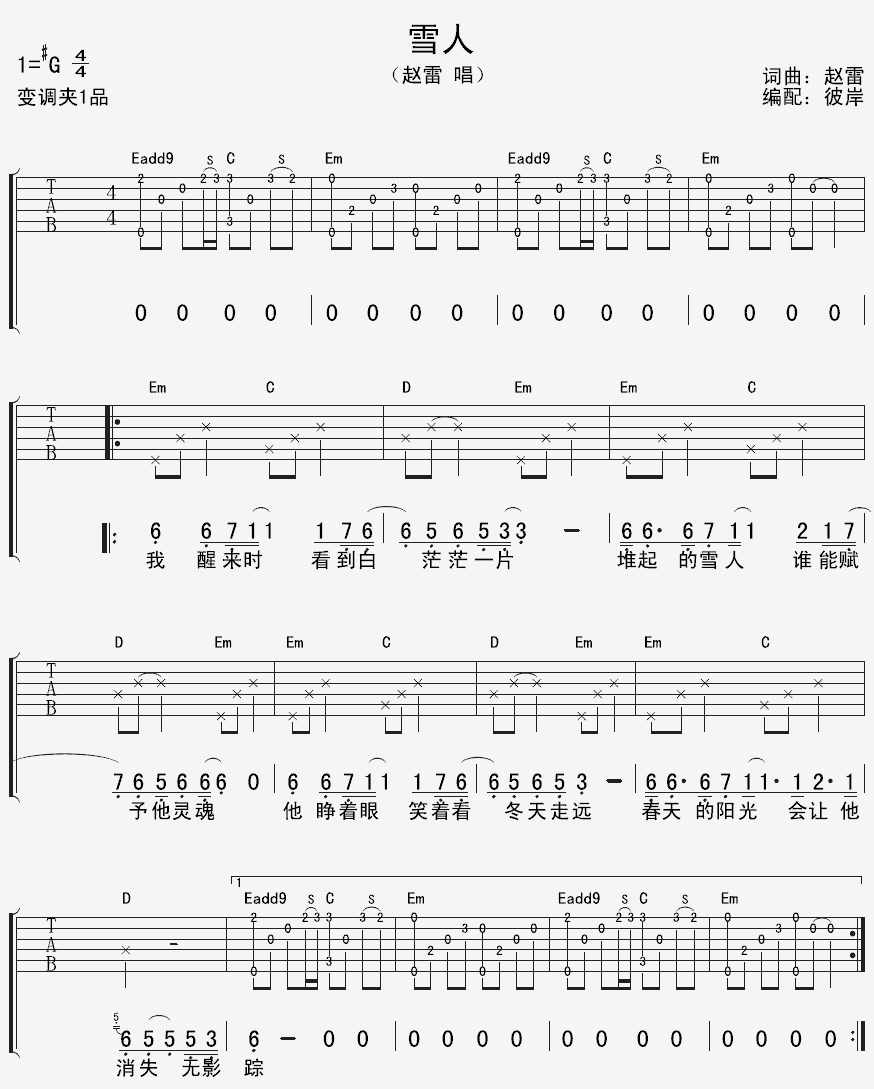 雪人吉他谱 - 赵雷 - G调吉他弹唱谱 - 原版