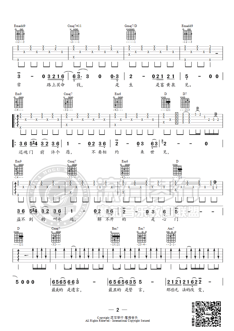 曲谱介绍: 还魂门吉他谱_胡彦斌_《还魂门》G调弹唱六线谱_高清图片谱分享,《还魂门》是由胡彦斌作曲并演唱的一首歌,同时这首歌也是2016年爱奇艺出品电视剧《老九门》的主题曲。一扇“还魂门”,一曲销魂曲,伴随着神秘色彩的情节发展,铺叙而来。钢琴,分解和弦缓缓行进着,跟着管弦乐的加入,透出一股阴冷和诡异。胡彦斌开腔唱着:“打开地狱的大门,不请自来贪欲念”,以孟婆生死判官们的视角,来谈生论死,一下子就超脱出来。歌词下笔如刀,入木三分,今生贪嗔痴,爱恨难舍离,来世“是生是畜黄泉见”,“盗不到的叫永远,解不开的是心门。”