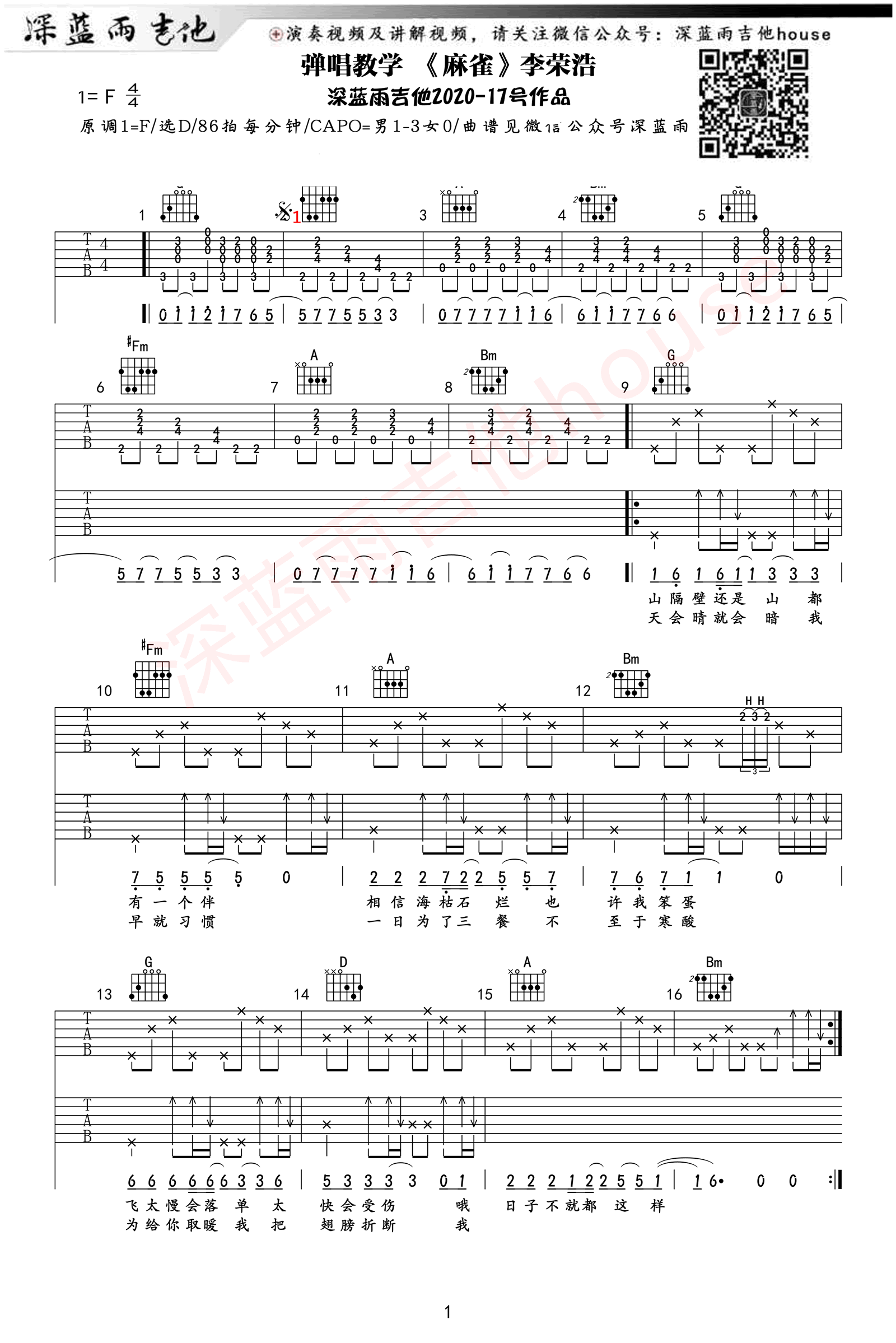 曲谱介绍: 麻雀吉他谱_李荣浩_《麻雀》D调原版六线谱_吉他弹唱教学分享,《麻雀》这首歌是由李荣浩作词作曲并演唱,李荣浩在演唱《麻雀》时,他的歌声既有“自嘲”,也有“倔强”,更有专属于他的独特的“温柔”。这首歌的歌词意义深刻,直接写出了都市男女的感受,让人产生强烈共鸣。麻雀虽平凡渺小,却能“飞翔在乌云之中”,简单几句将“普通人”内心的“梦想”和“向往”一一道尽,自嘲中仍有希望。