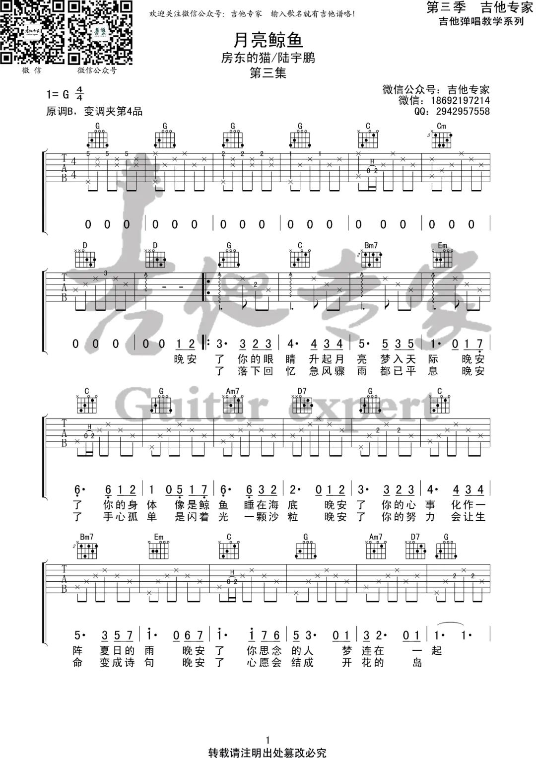 曲谱介绍: 《月亮鲸鱼》吉他谱_房东的猫/陆宇鹏_G调原版弹唱谱_高清六线谱分享,《月亮鲸鱼》是由房东的猫和陆宇鹏合作演唱的一首歌,这是一首治愈系的歌曲,房东的猫和陆宇鹏都是自然治愈系的声音,这首被网友称作“人间小治愈”、“睡前小夜曲”的单曲,包含了一切人间最美好的向往,透过月亮、鲸鱼、大海、星空、日落和森林等事物描绘出一幅完美又浪漫的梦境。歌曲的弦乐中加入了海浪、风琴的元素,将听众的回忆拉回那个只有平房和蒲扇的夏天夜晚,一家人躺在院子里的凉席上扇着蒲扇仰望着星空,风声蝉声伴着我们入眠。