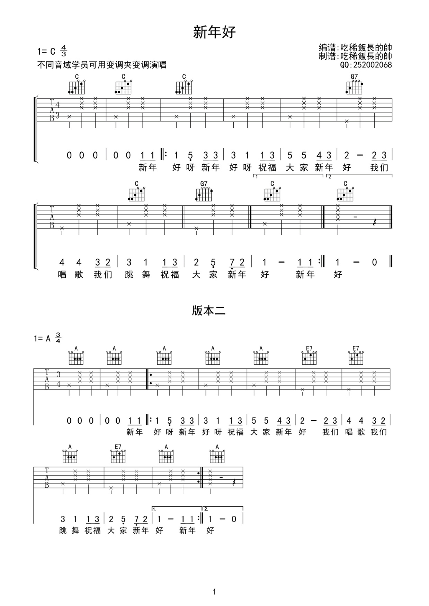 曲谱介绍: 《新年好》吉他谱_C调吉他弹唱谱