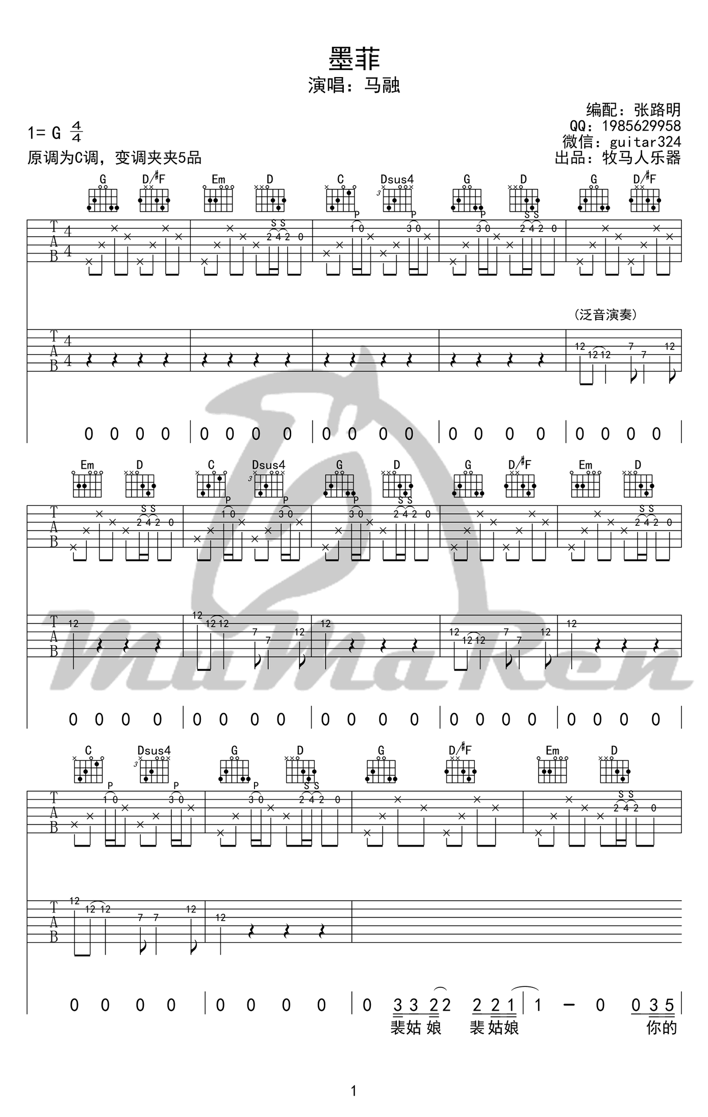 曲谱介绍: 墨菲吉他谱_马融_《墨菲》G调原版弹唱谱六线谱_高清图片谱分享,《墨菲》是由民谣歌手马融演唱的一首民谣歌曲。在漂泊中寻找生活,在忧伤中追求理想,经历过失落彷徨,却不改自己的音乐理想,热爱生活,更热爱音乐,马融在不断努力中坚持着自己的梦想,用自己的热诚让艰苦化做欢笑,用动人的旋律绽放自己的光芒,你喜欢这首好听的《墨菲》吗?