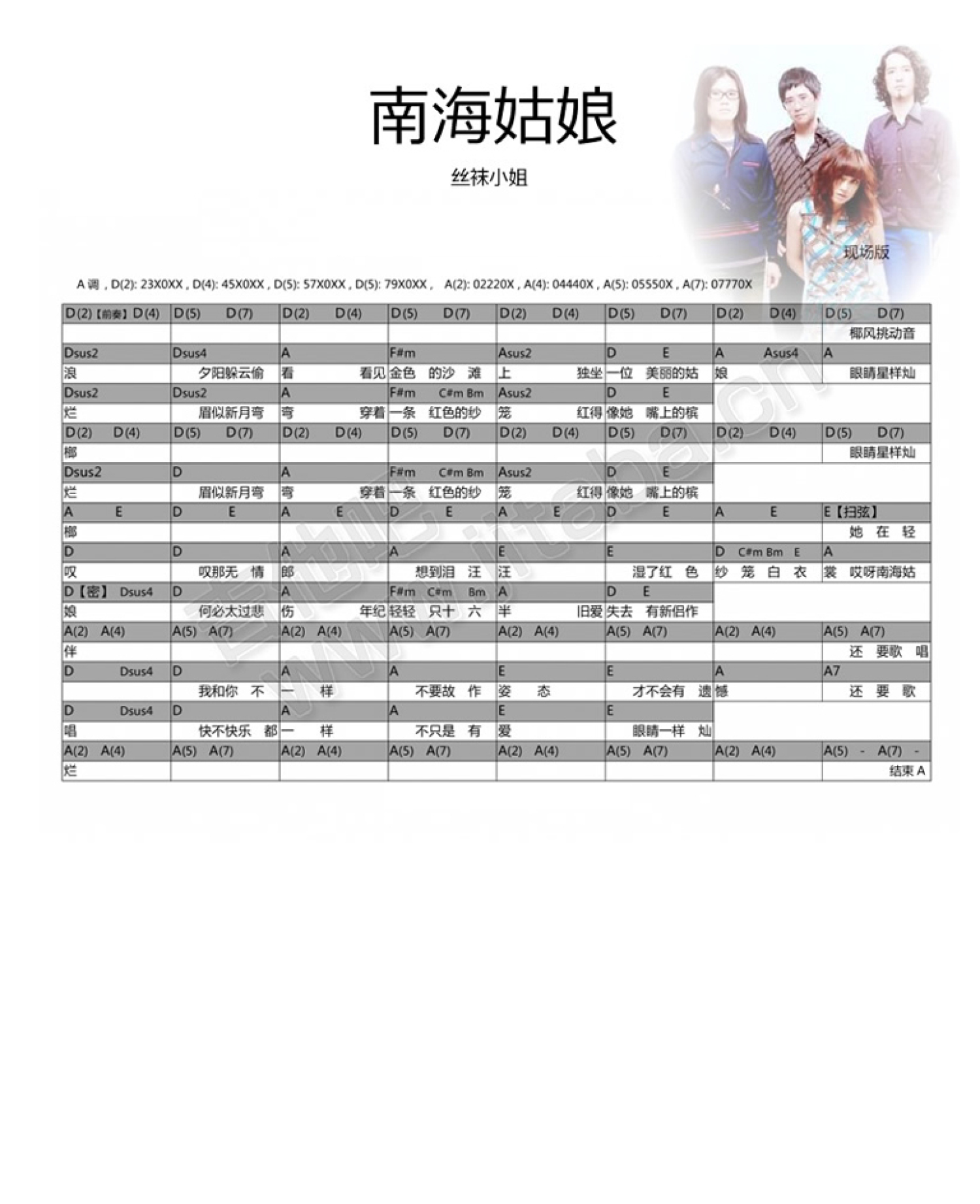 南海姑娘吉他谱 - 丝袜小姐组合 - A调吉他弹唱谱