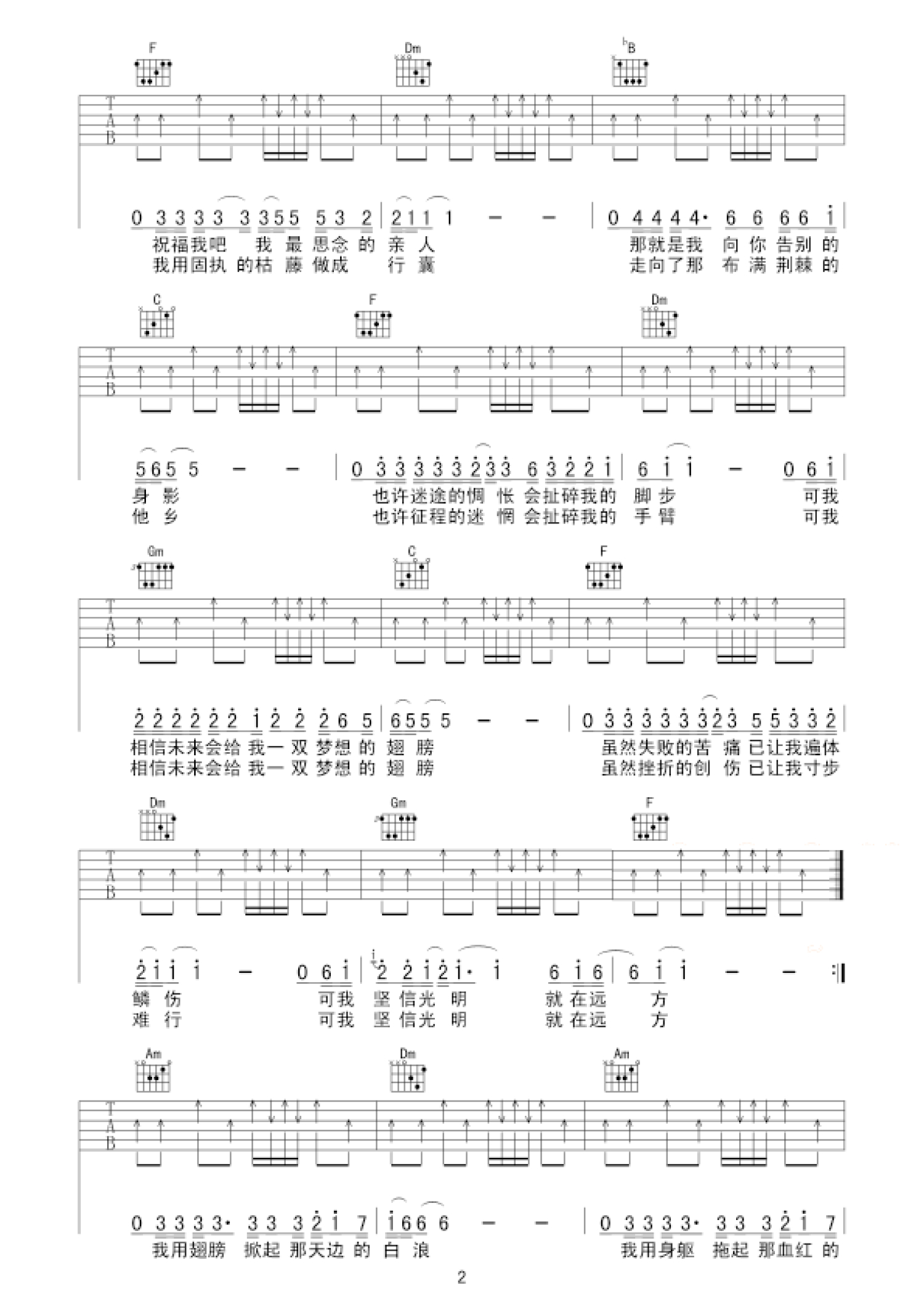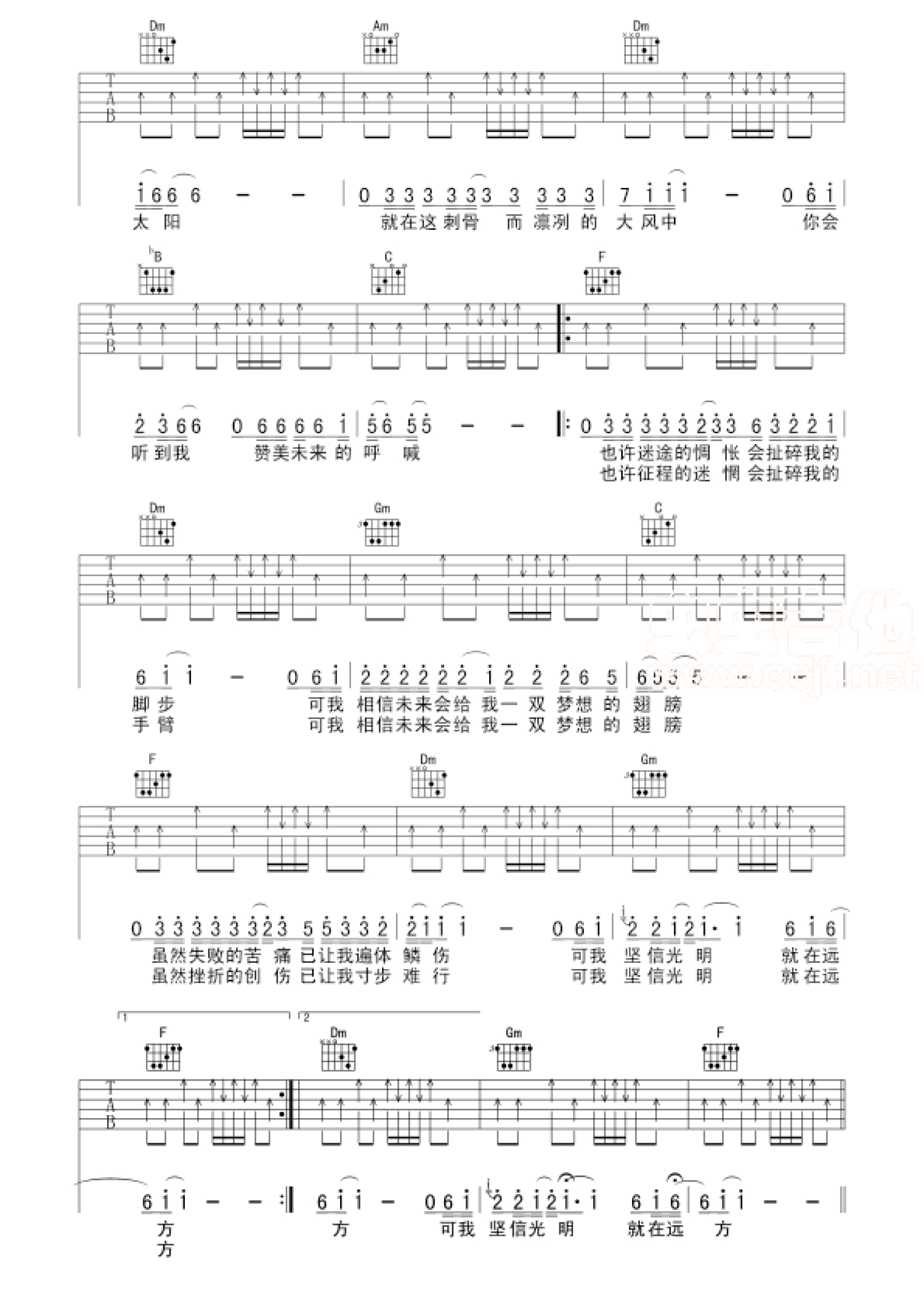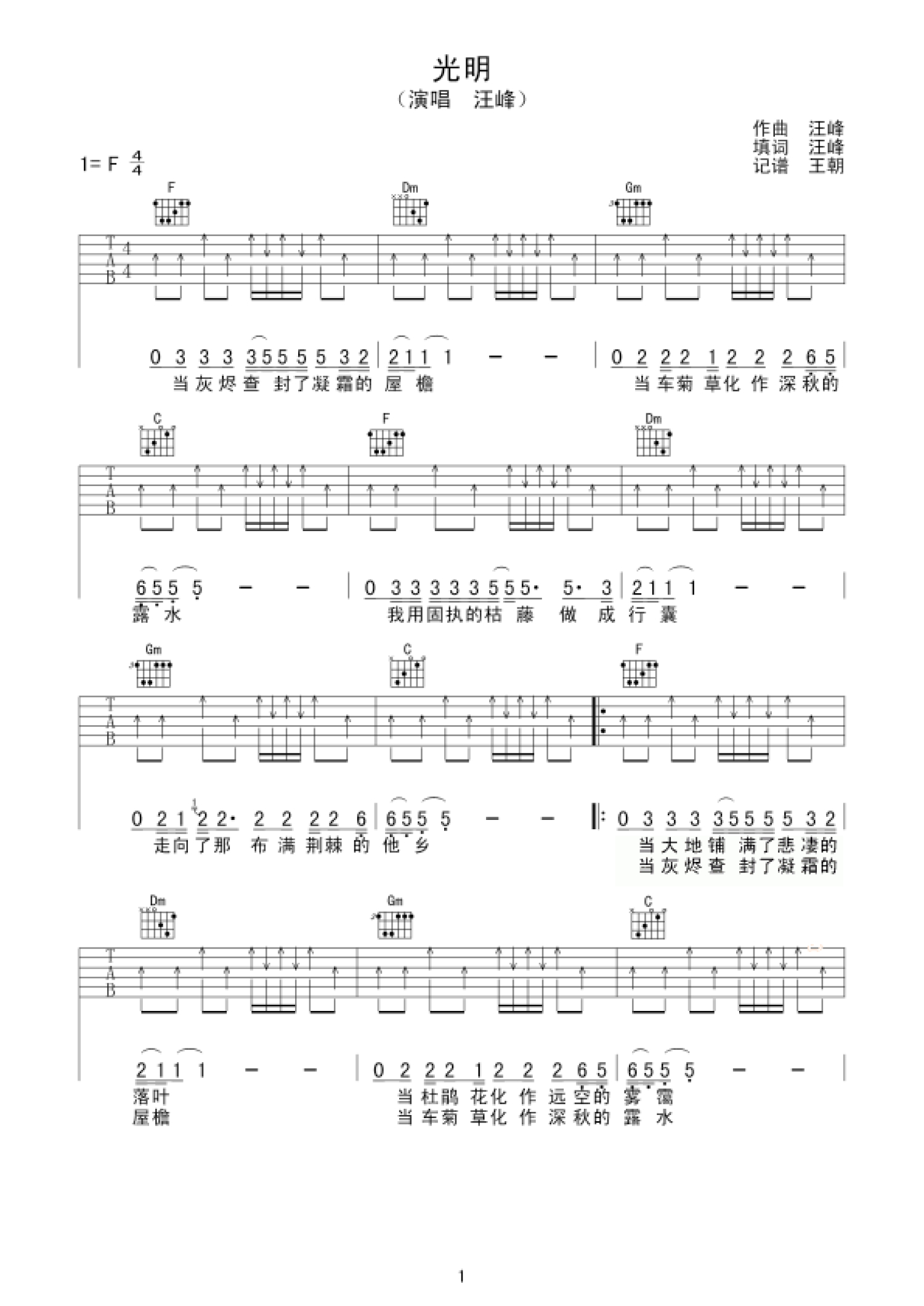 曲谱介绍: 汪峰的《信仰在空中飘扬》专辑中的单曲“光明”,以其博大的气势、意境如诗一般的歌词,加之激励人心的态度,在“春天里”之后,又一首广受大家喜爱的歌曲。感谢编配制谱王朝,光明吉他谱图片谱格式,选调F,朋友们可以参考本吉他和弦示意图和扫弦节奏型进行吉他弹唱。