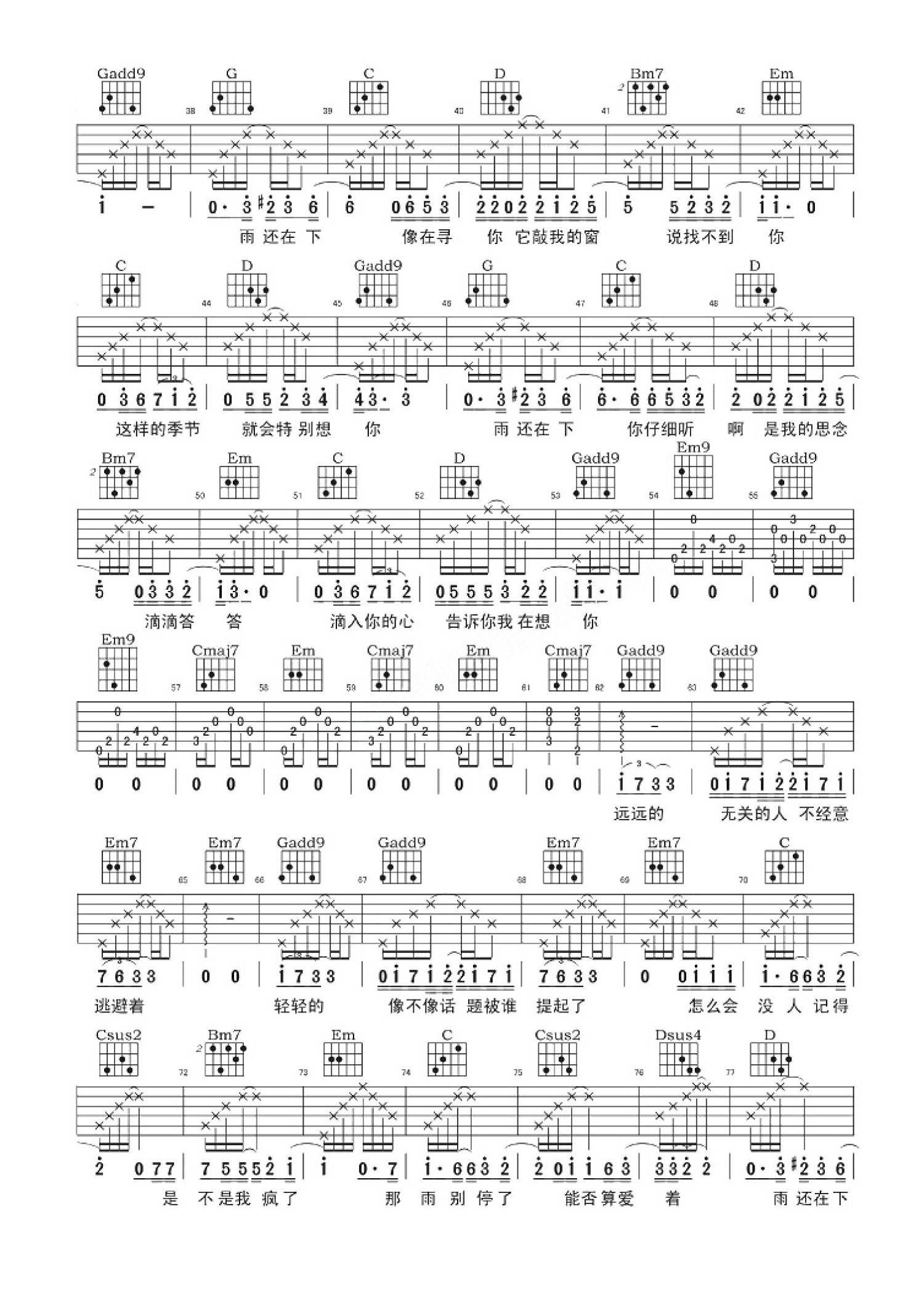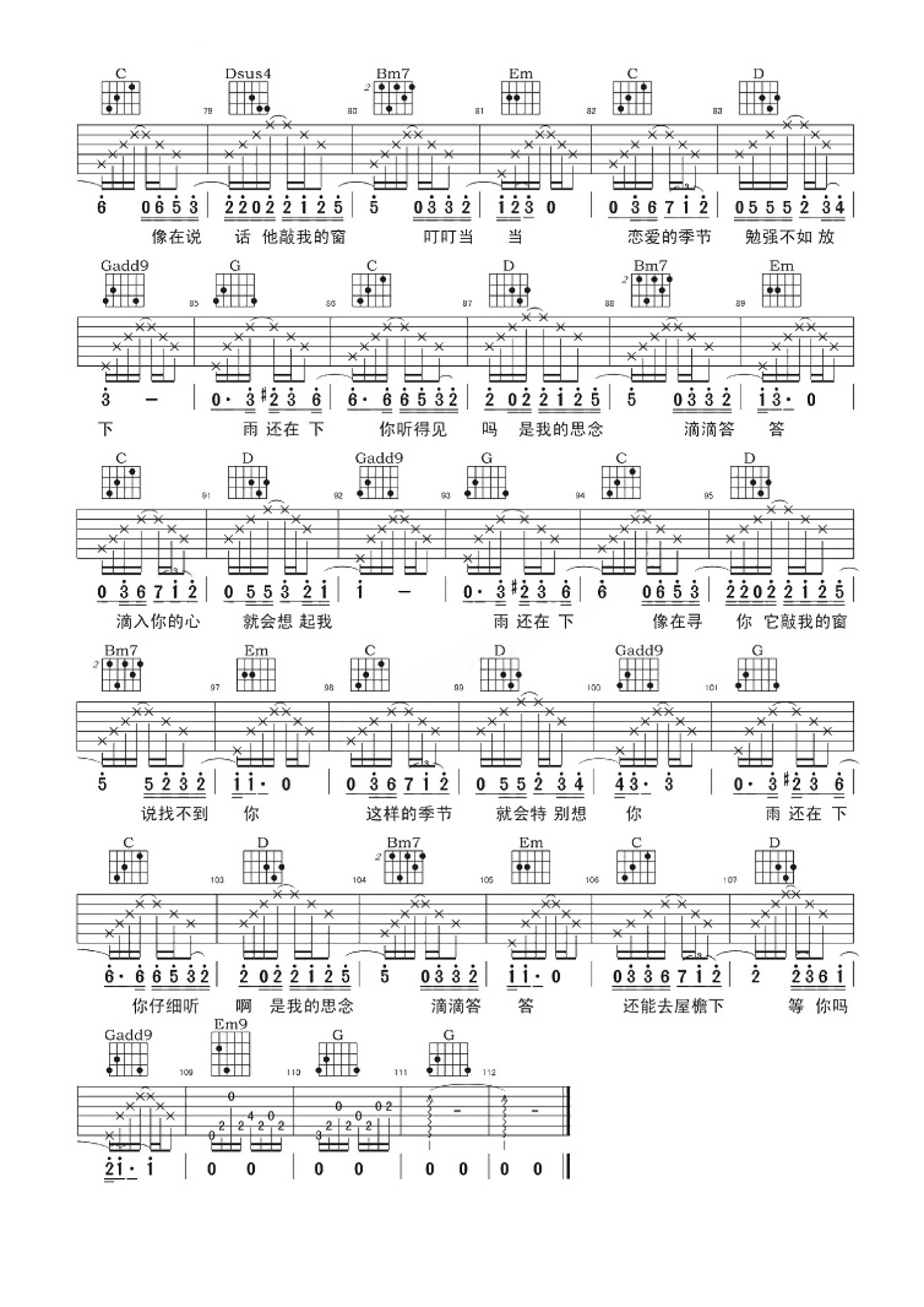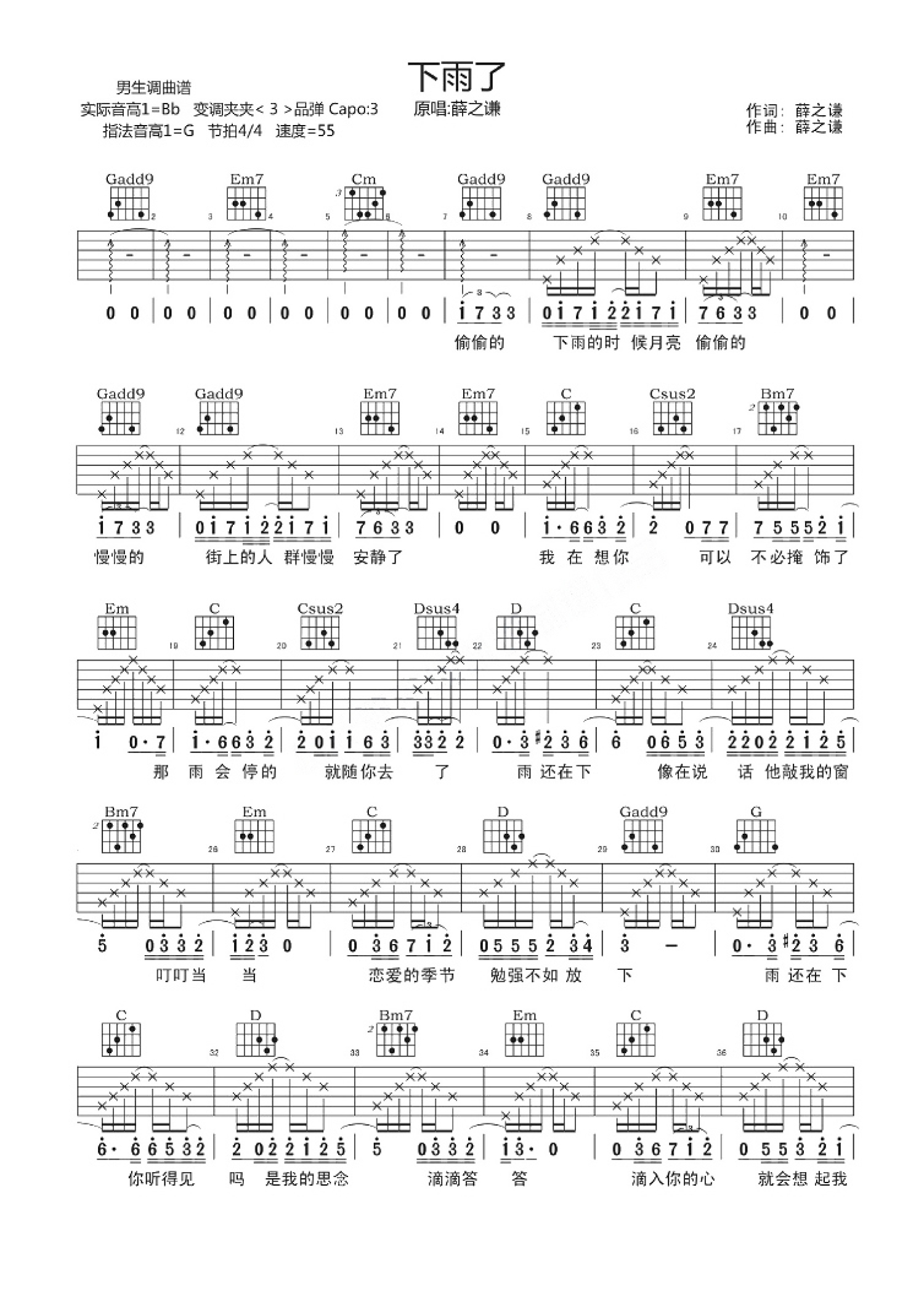 曲谱介绍: 薛之谦下雨了吉他谱,和弦谱编配,下雨了吉他弹唱谱,原调B,变调夹夹三品,选用G调指法,薛之谦词曲演唱的《下雨了》,收录于《初学者》专辑中。安静而忧伤的旋律仿佛是落在每一个为爱悲伤的人心里的雨滴,令人心痛。下雨了作词:薛之谦作曲:薛之谦演唱:薛之谦偷偷的下雨的时候月亮偷偷的慢慢的街上的人群慢慢安静了我在想你可以不必掩饰了那雨会停的就随你去了雨还在下像在说话他敲我的窗叮叮当当恋爱的季节勉强不如放下雨还在下你听得见吗是我的思念滴滴答答滴入你的心就会想起我雨还在下像在寻你它敲我的窗说找不到你这样的季节就会特别想你雨还在下你仔细听啊是我的思念滴滴答答滴入你的心告诉你我在想你远远的无关的人不经意逃避着轻轻的像不像话题被谁提起了怎么会没人记得是不是我疯了那雨别停了能否算爱着雨还在下像在说话他敲我的窗叮叮当当恋爱的季节勉强不如放下雨还在下你听得见吗是我的思念滴滴答答滴入你的心就会想起我雨还在下像在寻你它敲我的窗说找不到你这样的季节就会特别想你雨还在下你仔细听啊是我的思念滴滴答答还能去屋檐下等你吗