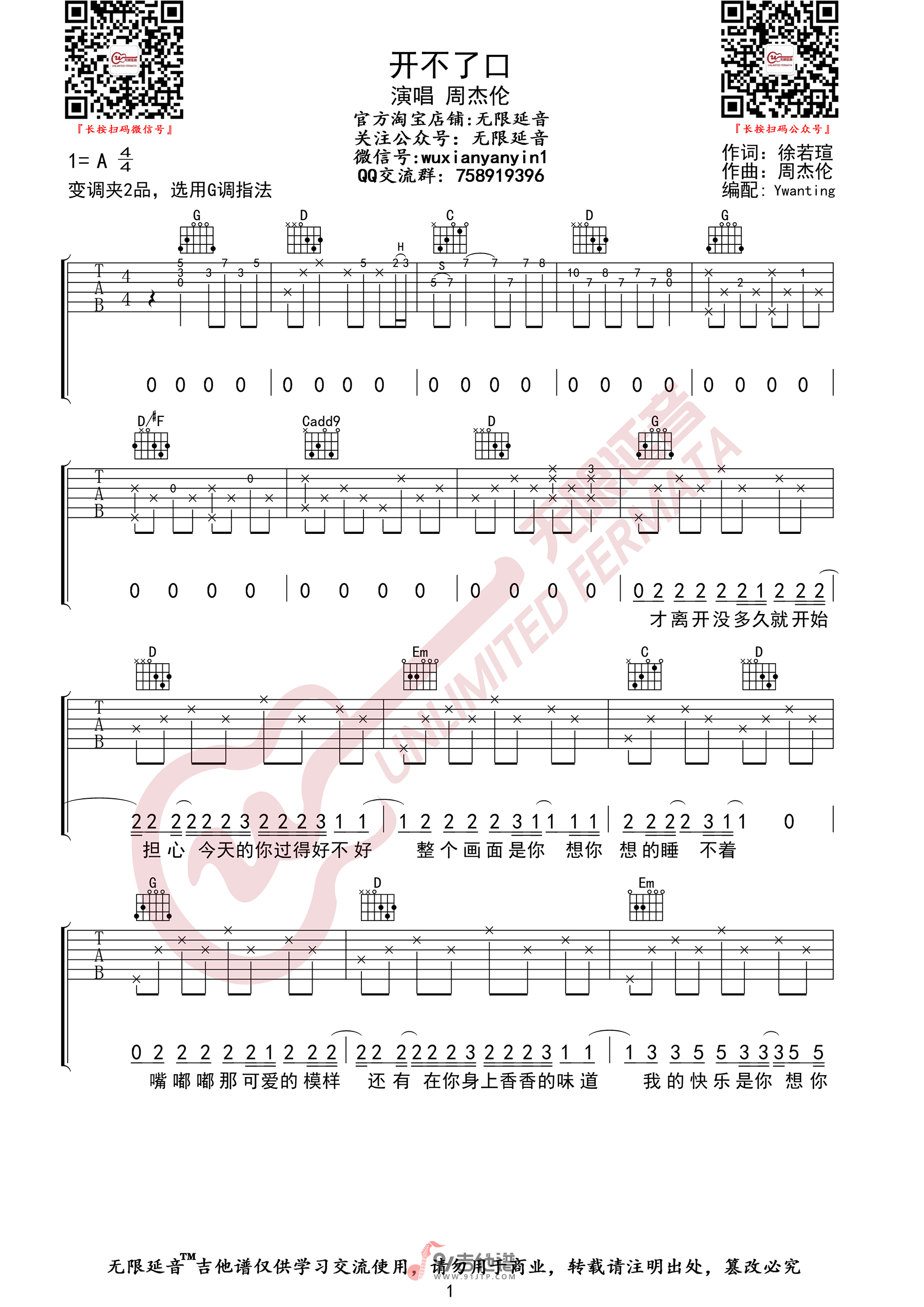 曲谱介绍: 曲谱简介:开不了口吉他谱,周杰伦演唱的一首歌曲,4/4拍的节奏,这首歌曲的原调为A调,这里曲谱采用了G调指法进行编配,演唱时夹变调夹2品可回到原调,也可根据个人实际嗓音情况选择。曲谱由无限延音编配出品。这首歌是一首蕴涵动人情感的歌曲,在R&B骨架中加重节奏,加上流畅的说唱以及古典前奏,充分体现了周杰伦能在音乐上自在地展现多样化和多变化,以及有足够的能力掌握各种音乐型态。