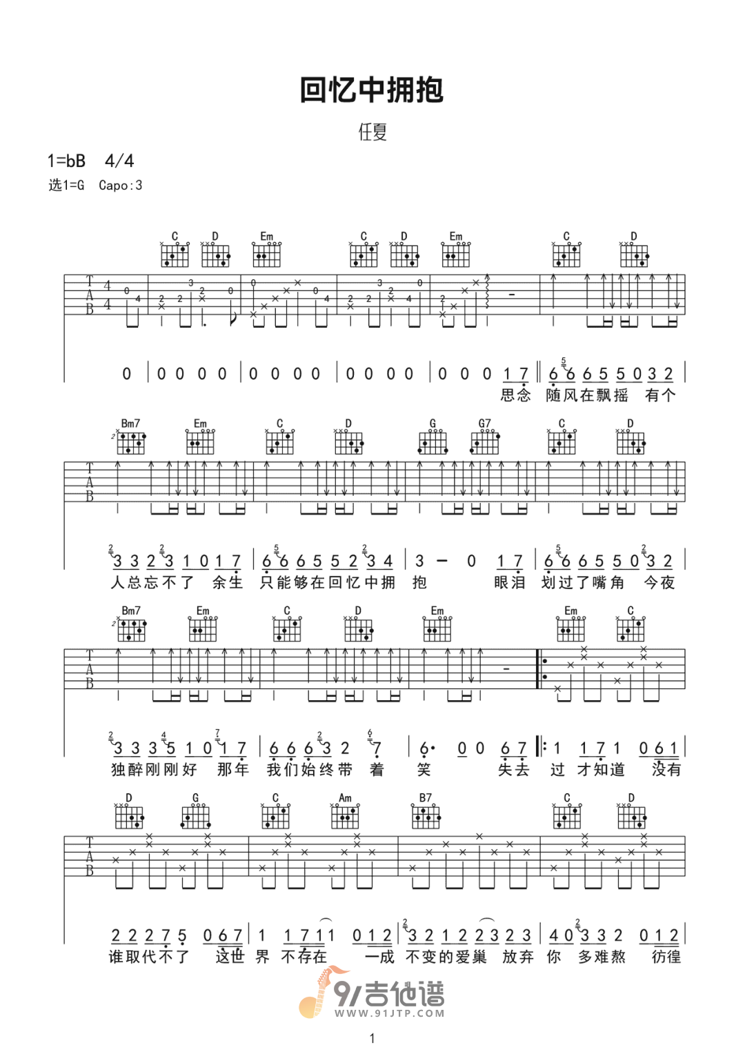 曲谱介绍: 曲谱简介:回忆中拥抱吉他谱,任夏演唱的一首歌曲,4/4拍的节奏,这首歌曲的原调为降B调,这里曲谱采用了G调指法进行编配,演唱时夹变调夹3品可回到原调,也可根据个人实际嗓音情况选择。曲谱由琴谱网更新上传,共3张高清图片弹唱吉他谱例,曲谱来源于网络转载,编配制谱者暂不详。
