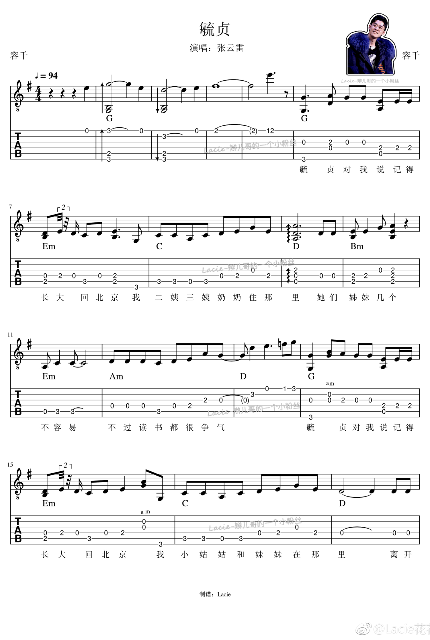 曲谱介绍: 《毓贞》吉他谱,张云雷的首支单曲,歌声醇厚温润歌词平淡却意境温暖美好。歌曲讲述几代人北京的回忆,一个关于血浓于水,叶落归根的故事。融合了苏三起解和林海雪原的戏曲唱段两句戏词,唱出一个游子依依不舍别离北京,胸中有壮志而未酬,却始终想着要叶落归根的心情。