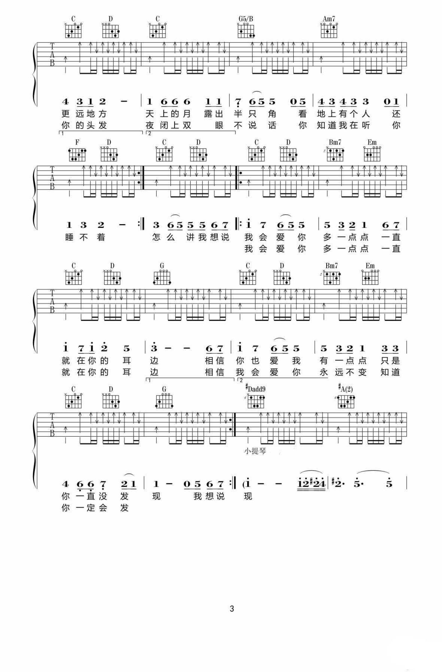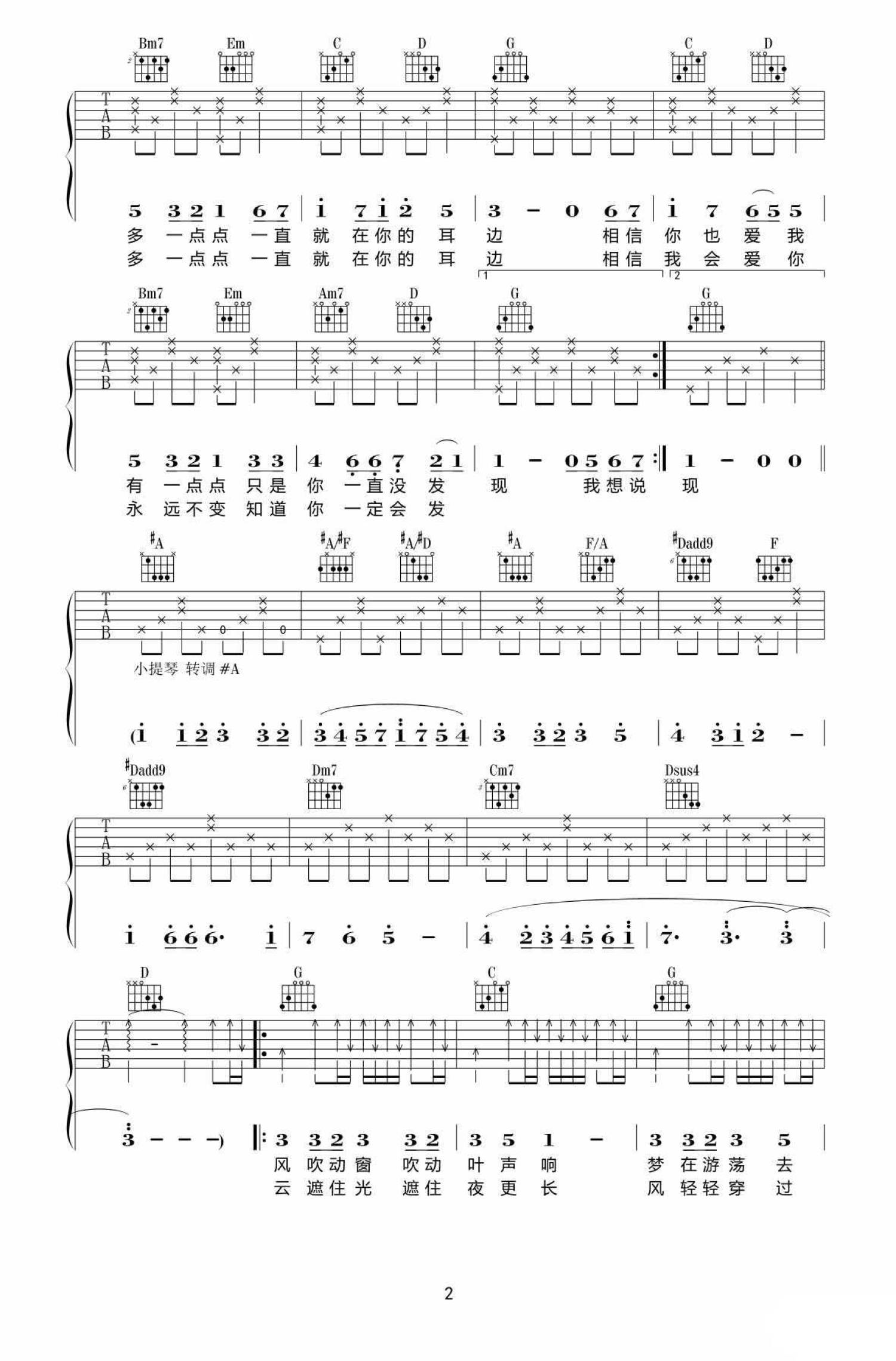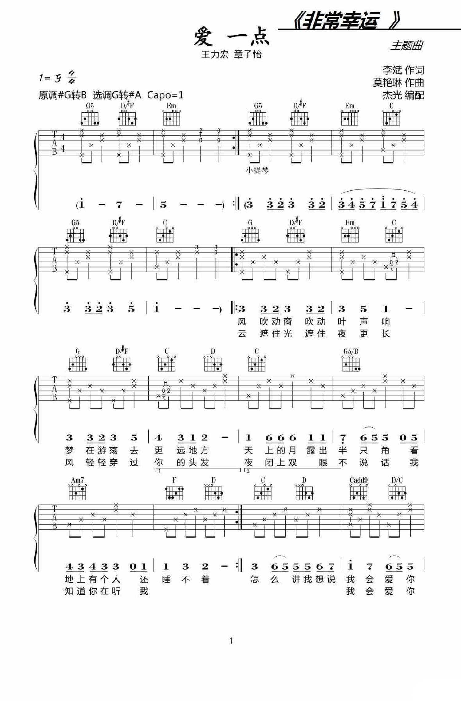 曲谱介绍: 爱一点吉他谱  >爱一点吉他六线谱,编配杰光,原调#G转B,选调G转#A,Capo夹1品。歌曲《爱一点》原唱是莫艳琳,收录在她的创作专辑《宅情歌》里面。电影《非常幸运》的男女主演章子怡和王力宏重新演绎了这首主题曲,爱一点曲调明丽动感,男生嗓音温暖磁性,女生声音轻柔绵软,在悠扬的吉他伴奏下,让人轻松惬意如沐春风。如果在弹奏第一次间奏的转#A调初感觉和弦难按,琴友们可以试试把原调为A调,这样间奏就刚好转成C调了。