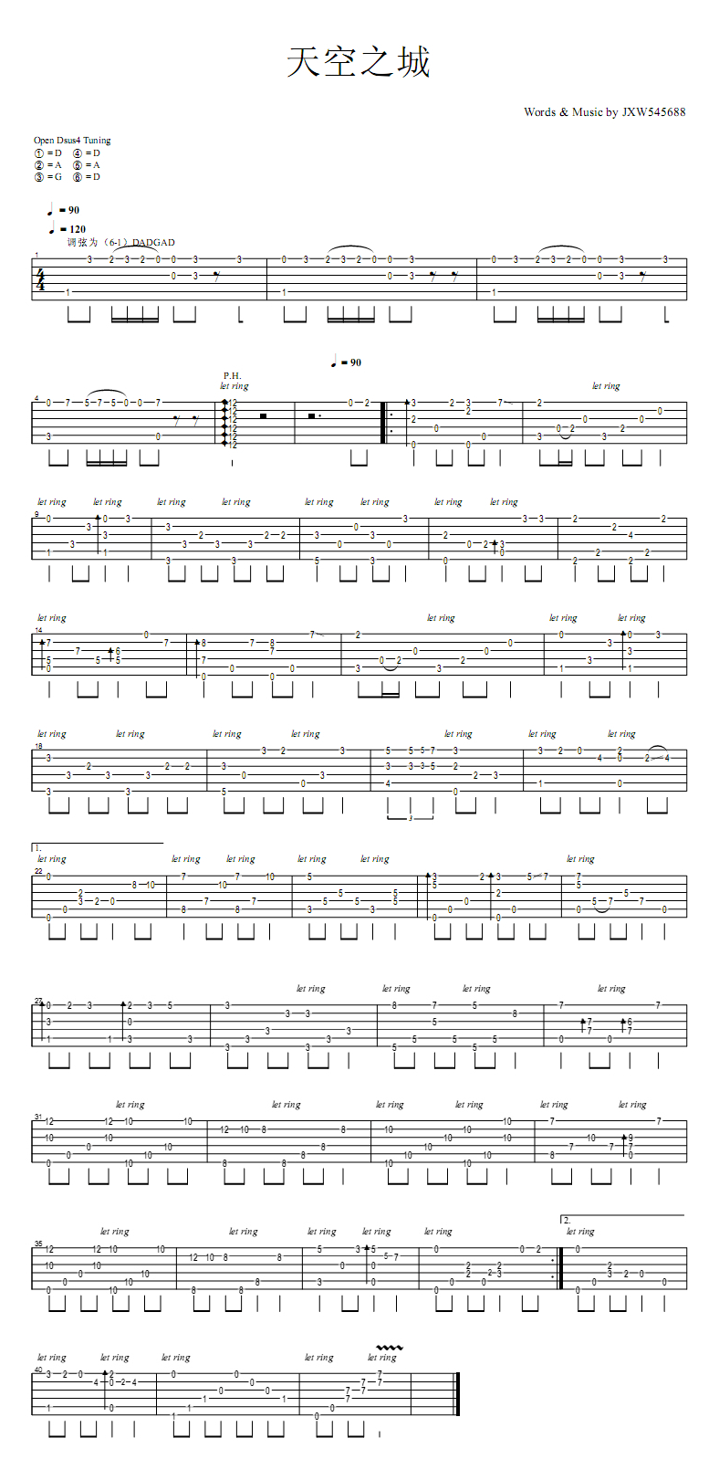 曲谱介绍: 名曲《天空之城》吉他独奏谱,共有1张高清图谱,免翻页排版设计。