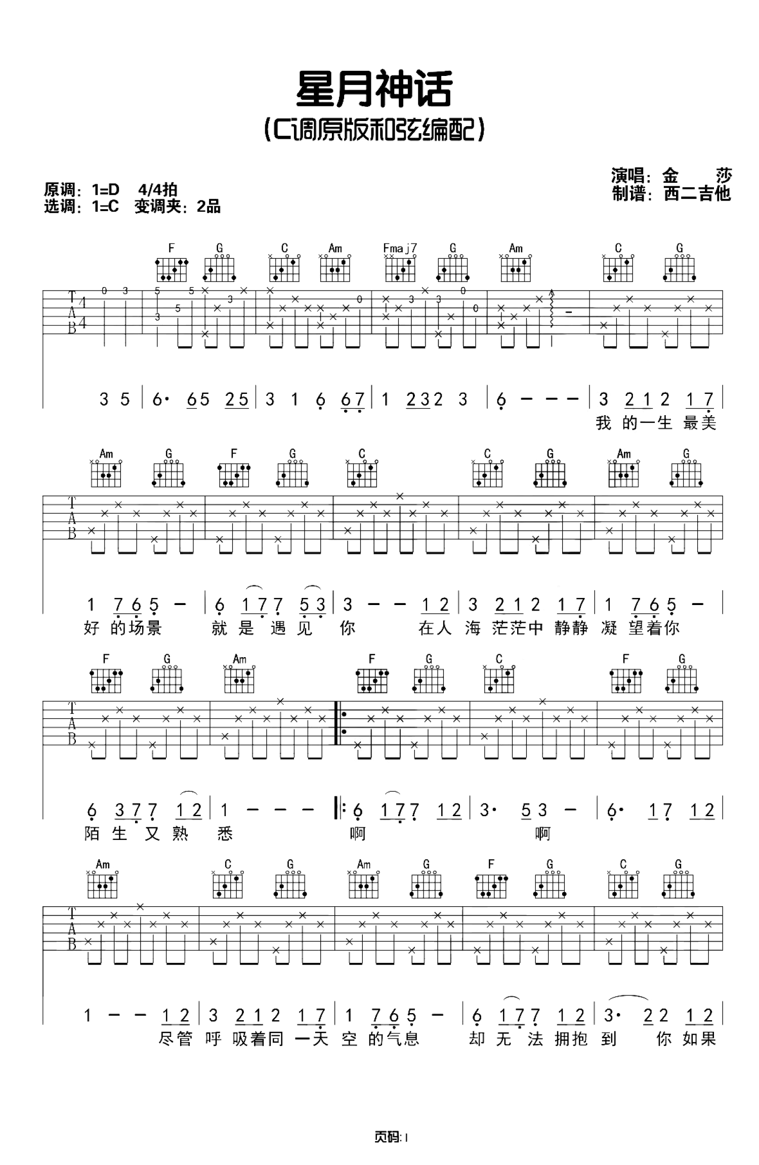 星月神话吉他谱 - 金莎 - C调吉他弹唱谱