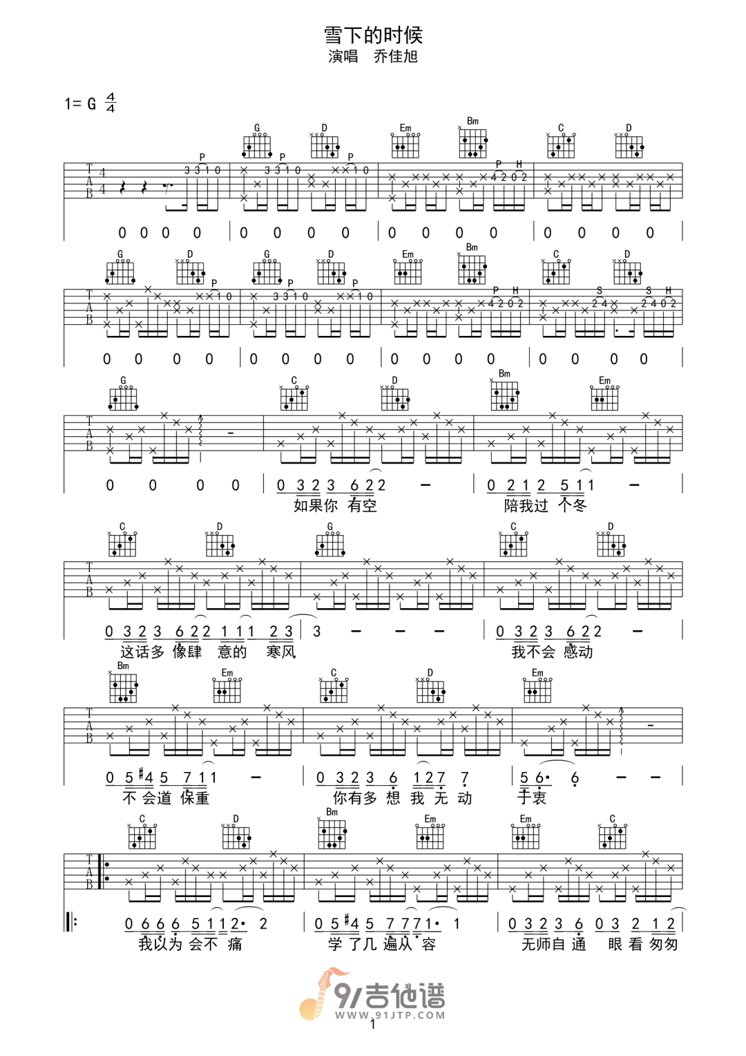 雪下的时候吉他谱 - 乔佳旭 - G调吉他弹唱谱 - 原版