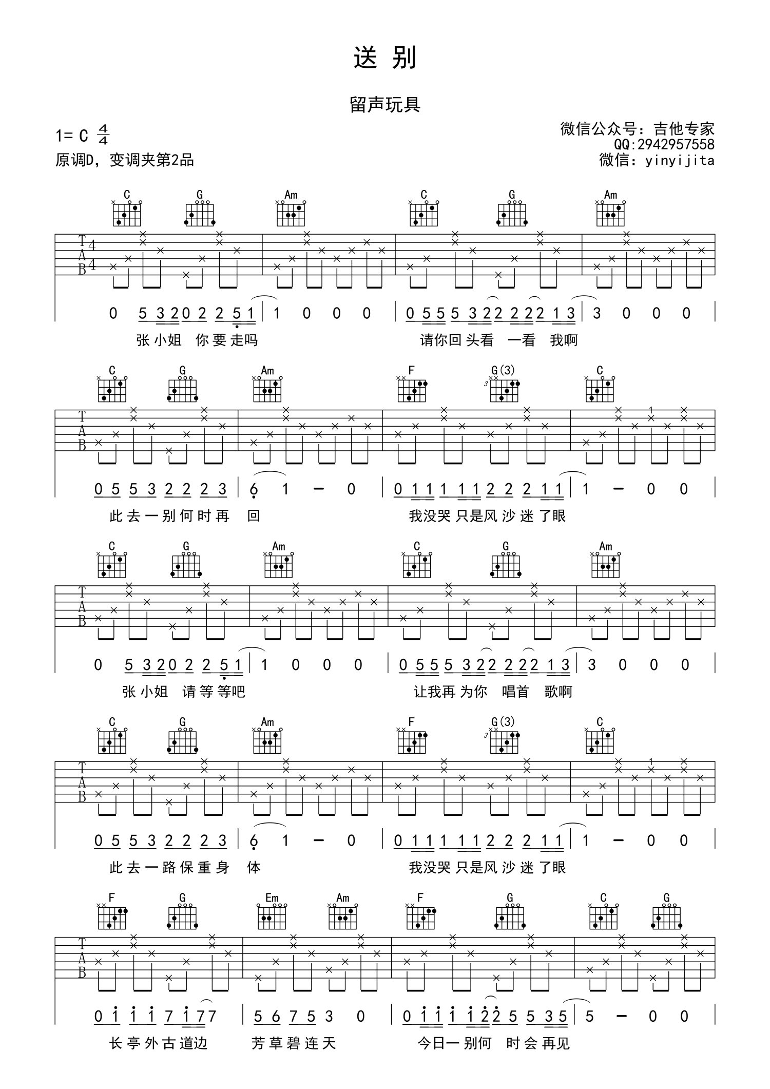送别吉他谱 - 留声玩具 - C调吉他弹唱谱