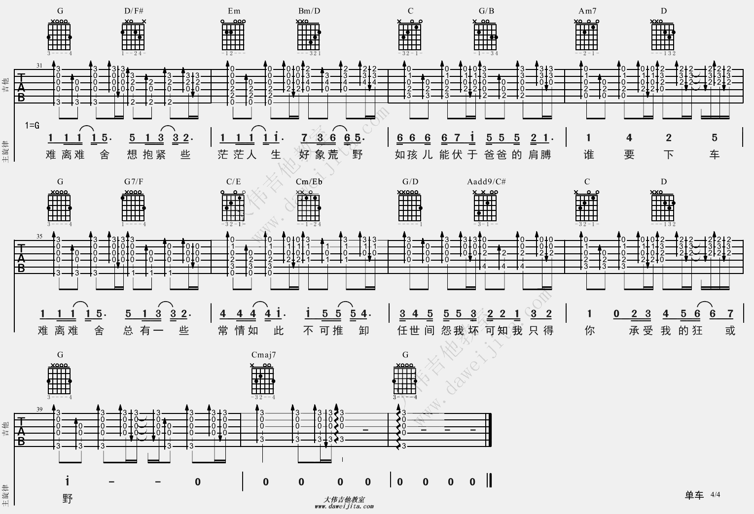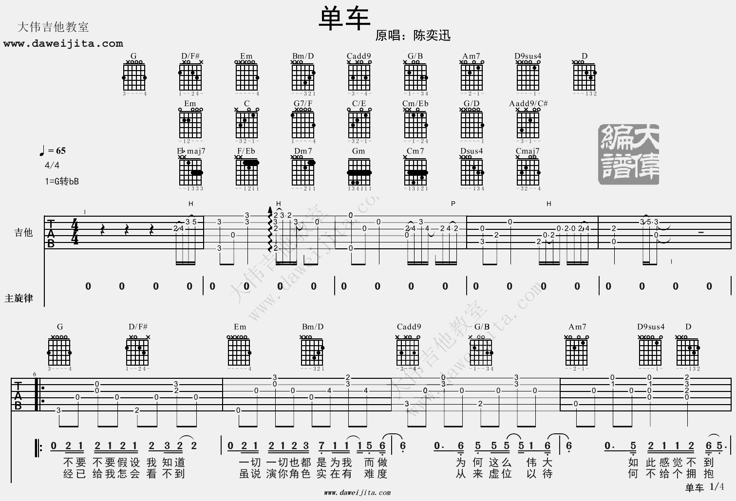 曲谱介绍: 陈奕迅《单车》吉他弹唱谱,采用B调指法编配,共有4张高清图谱。