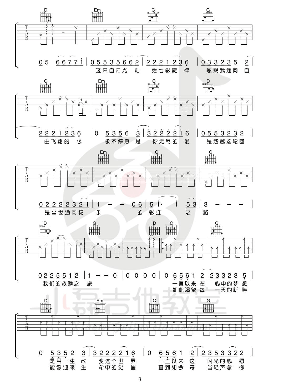 曲谱介绍: 《救赎之旅》吉他谱_许巍_G调版原版六线谱_吉他弹唱教学分享,《救赎之旅》是由许巍作词作曲并演唱的一首歌曲。许巍根据他这几年最深的感触,明白到自己是需要被拯救的,被音乐和爱他的人拯救,他觉得自己有责任将这种感触分享给更多人,因此创作了这首歌。 此版本的曲谱及教学来源于小磊吉他教室出品,歌曲原调为B调,这里采用了G调指法根据原版进行编配,演唱时夹变调夹4品回到原调。这首歌编配难度不大,只是部分地方节奏需要注意一些,节奏型及和弦都比较简单。 《救赎之旅》吉他谱_许巍_G调版原版六线谱_吉他弹唱教学视频:   《救赎之旅》吉他谱_许巍_G调版原版吉他弹唱六线谱_高清图片谱1-2: