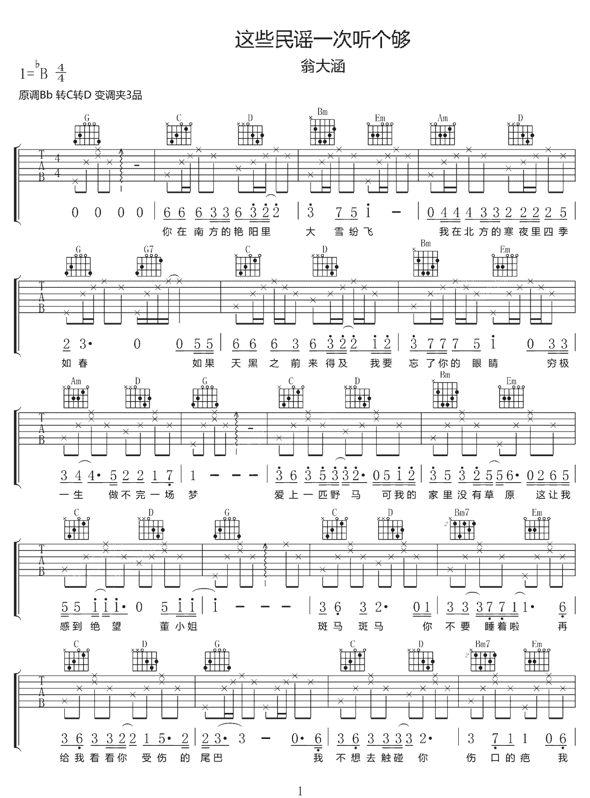 曲谱介绍: 《这些民谣一次听个够》吉他谱_翁大涵_G调原版弹唱六线谱分享,《这些民谣一次听个够》是由翁大涵演唱的一首各大民谣歌曲的串烧歌曲。这首歌中融合了多首经典的民谣歌曲,相信其中大部分都是你们所喜欢的。 此版本的曲谱来源于网络搜集,版权归原作者所有。歌曲原调为降B调,这里采用G调指法根据原版进行编配,演唱时夹变调夹3品。由于存在在多首歌曲,所有后面有转调及节拍直接的转换,有些难度,需要花时间练习。 《这些民谣一次听个够》吉他谱_翁大涵_G调原版弹唱六线谱1-3: