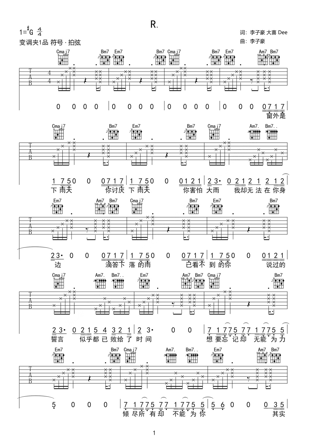 曲谱介绍: R.吉他谱_李子豪/大喜_《R.》G调原版弹唱六线谱_高清图片谱分享,《R.》是由李子豪和大喜演唱的一首歌。窗外是下雨天,你讨厌下雨天,你害怕大雨,我却无法在你身边。分开之后,我还是会记得你讨厌下雨天。今天又下雨了,可我再也不能为你撑伞了。 此版本的曲谱来源于网络搜集,版权归原作者所有。歌曲原调为升G调,这里采用了G调指法根据原版进行编配,演唱时夹变调夹1品回到原调。曲谱编配有一定难度,在掌握拍弦技巧的情况下,还需要弄清楚节奏型,配合和弦转换。 R.吉他谱_李子豪/大喜_《R.》G调原版弹唱六线谱_高清图片谱1-2: