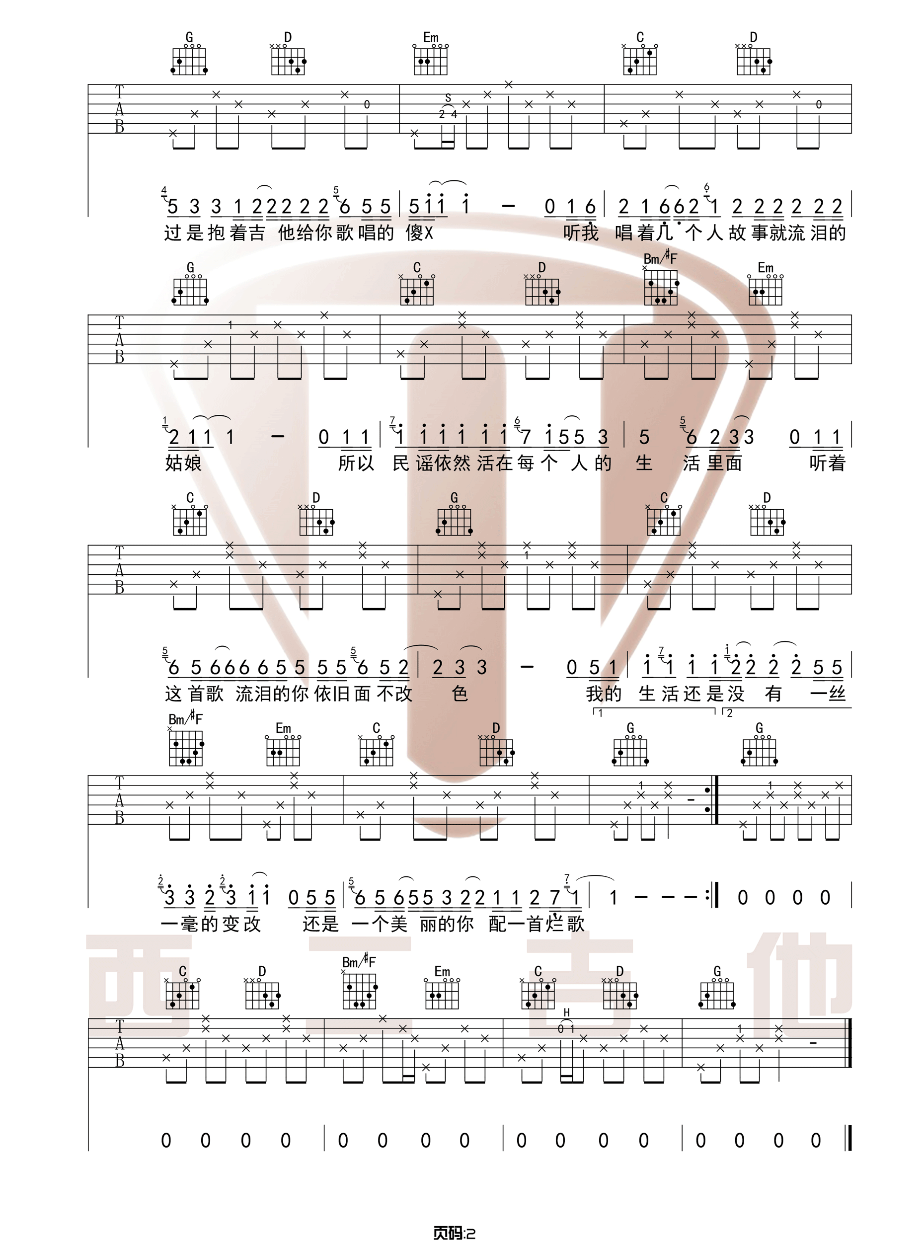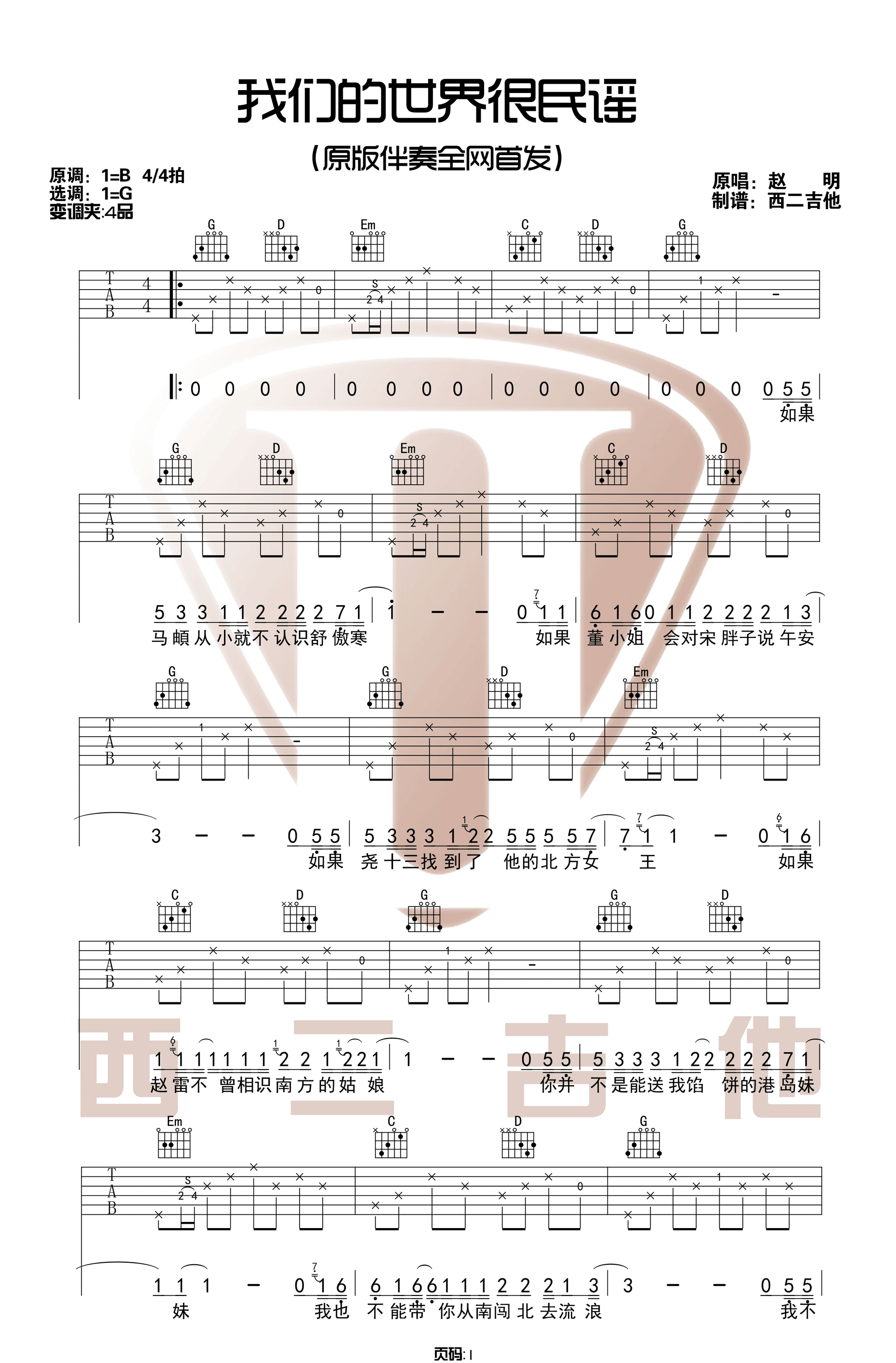 曲谱介绍: 《我们的世界很民谣》吉他谱_赵明_G调原版六线谱_吉他弹唱教学分享,《我们的世界很民谣》是由赵明作词作曲并演唱的一首民谣歌曲。里面提及了许多民谣歌手和歌曲,十分有意思,如果对这首歌有兴趣的朋友可以去听一下。 此版本的曲谱及教学来源于西二吉他出品,歌曲原调为B调,这里采用了G调指法根据原版进行编配,演唱时夹变调夹4品回到原调。歌曲编配难度不大,只存在一些很常规的滑音击弦等技巧,和弦及节奏型都比较简单。 《我们的世界很民谣》吉他谱_赵明_G调原版六线谱_吉他弹唱教学视频:   《我们的世界很民谣》吉他谱_赵明_G调原版吉他弹唱六线谱_高清图片谱1: