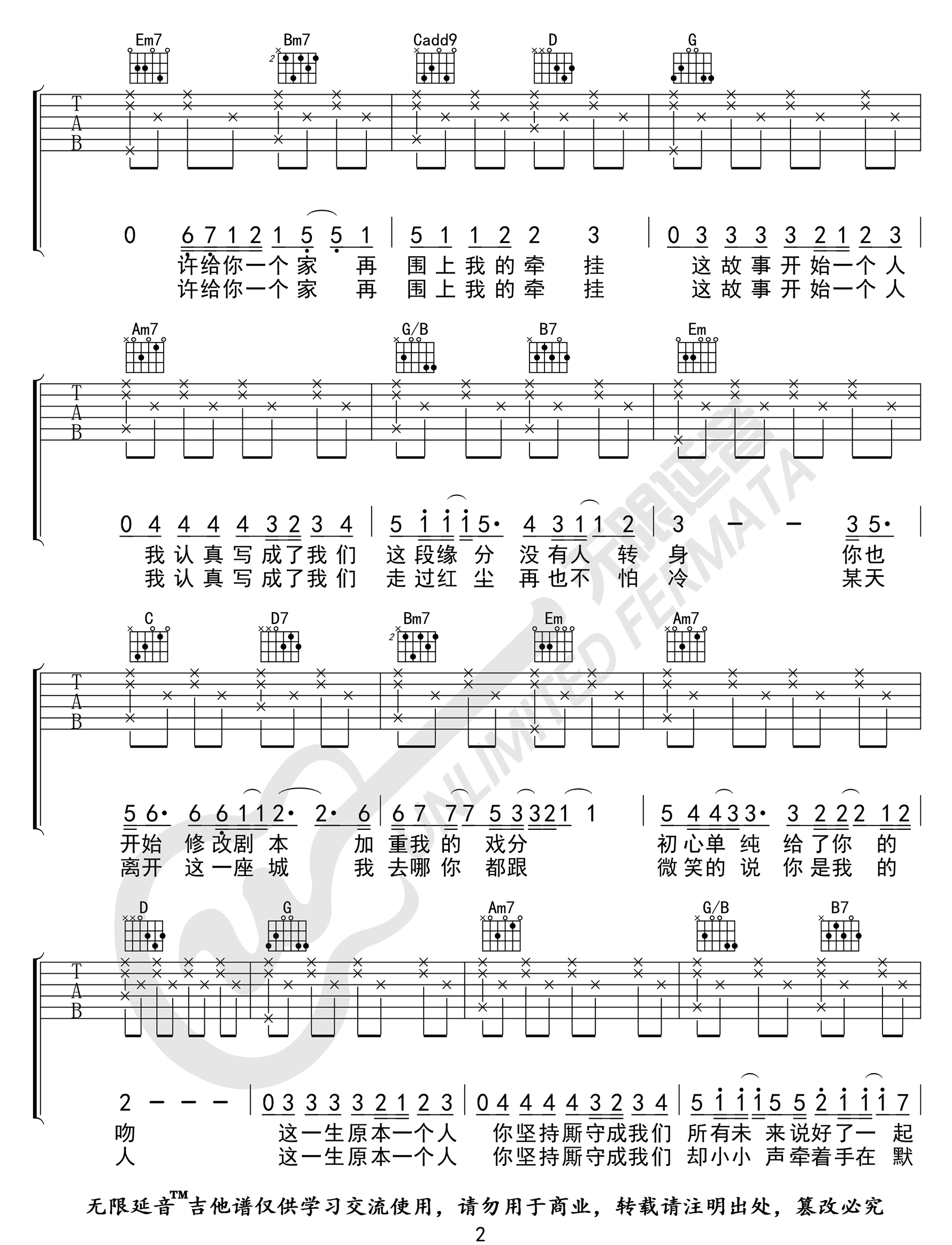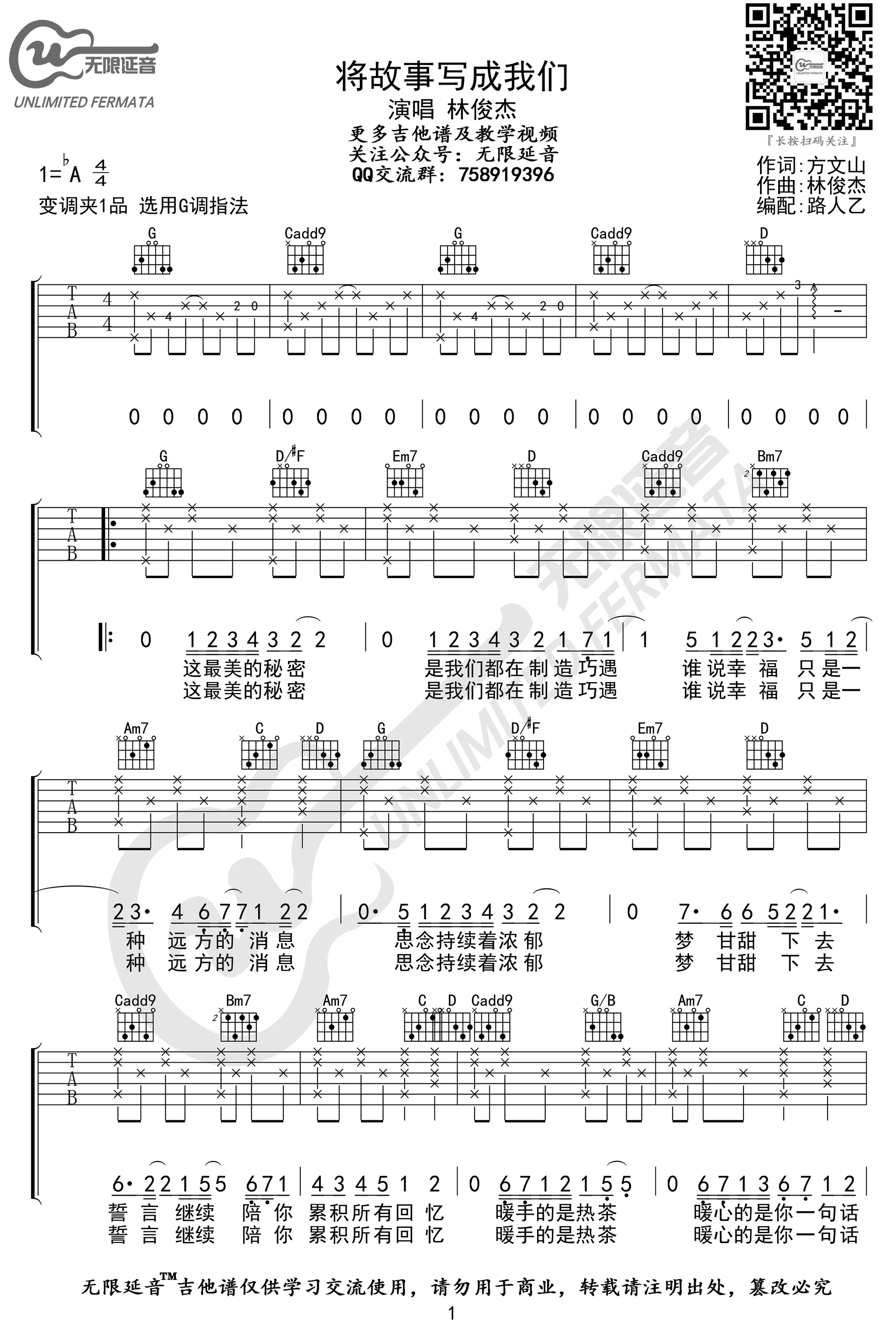 曲谱介绍: 《将故事写成我们》吉他谱_林俊杰_G调弹唱谱_高清六线谱分享,《将故事写成我们》是由林俊杰创作并演唱的一首歌。。歌词部分的细节描绘和一些小小的情话很立体将那种深刻珍贵的美好爱情传递给我们,将厮守故事化作最浪漫的告白。 此版本的曲谱来源于无限延音扒谱制谱,歌曲原调为降A调,这里采用了G调指法进行编配,演唱时夹变调夹1品回到原调。曲谱编配难度不大,只是有几个大横按需要克服一下,其他部分都比较简单。 《将故事写成我们》吉他谱_林俊杰_G调弹唱谱_高清六线谱1-2: