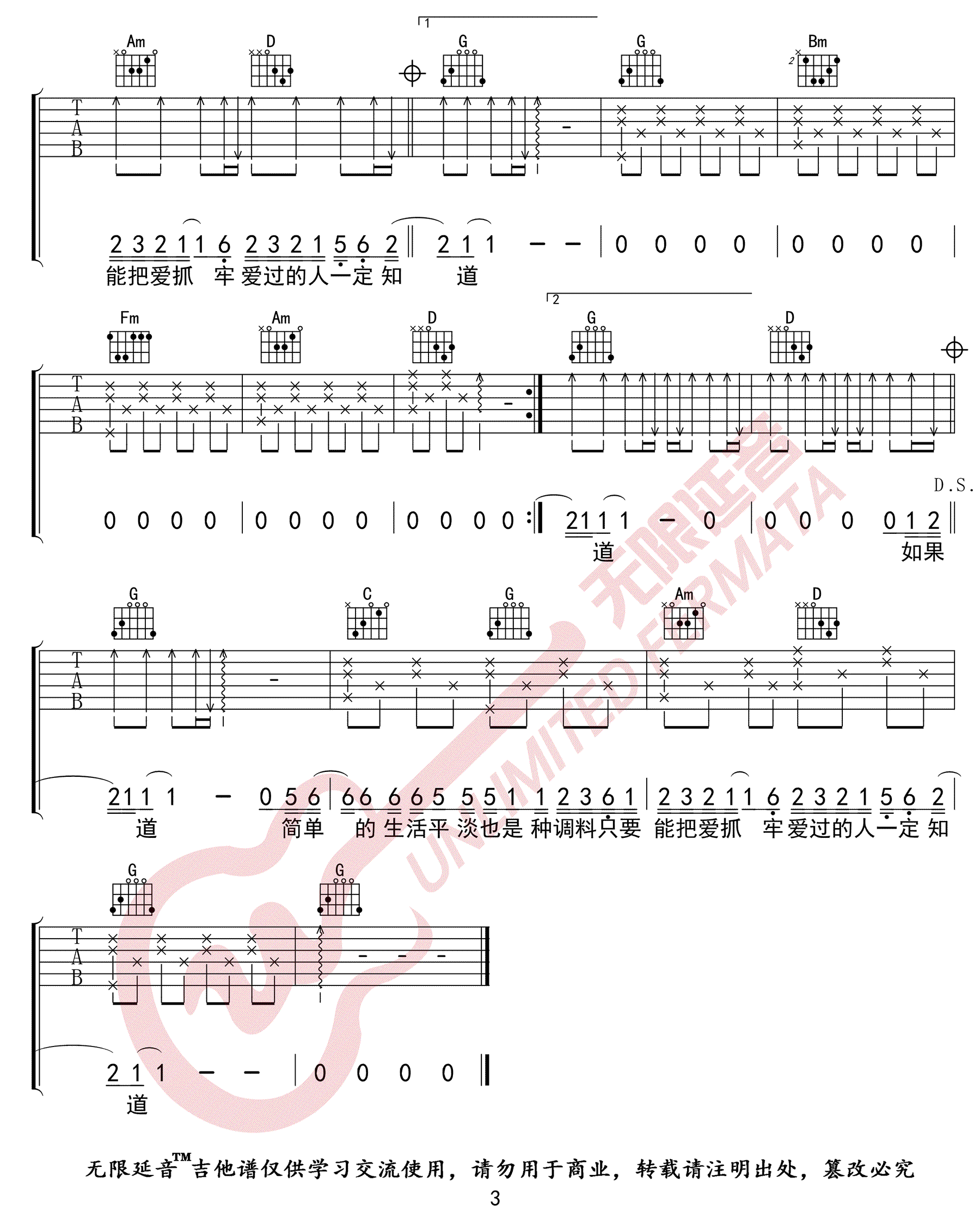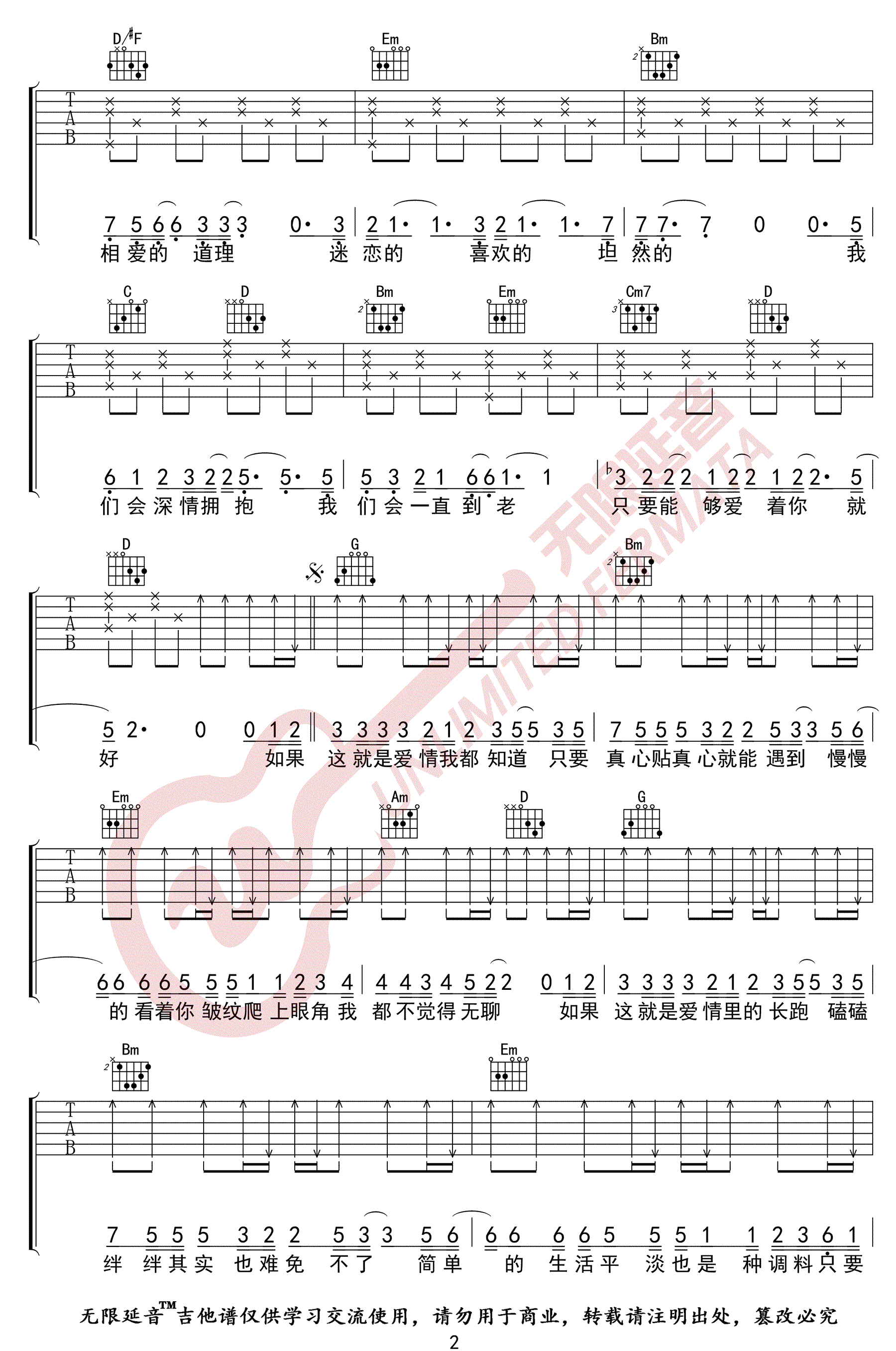 曲谱介绍: 《这就是爱情》吉他谱_李代沫_G调原版弹唱六线谱_高清图片谱分享,《这就是爱情》是由李代沫演唱的一首歌,这首歌最近在某平台大火,被拿来做各种视频的背景音乐。李代沫用细腻的情感唱出了爱情最好的结局,我们会深情拥抱,我们会一直到老。 此版本的曲谱来源无限延音扒谱制谱,歌曲原调为降B调,这里采用了G调指法根据原版进行编配,演唱时夹变调夹3品回到原调。这首歌编配难度不大,全曲除了大横按之外,其余部分的节奏型及和弦都非常简单。 《这就是爱情》吉他谱_李代沫_G调原版弹唱六线谱_高清图片谱1: