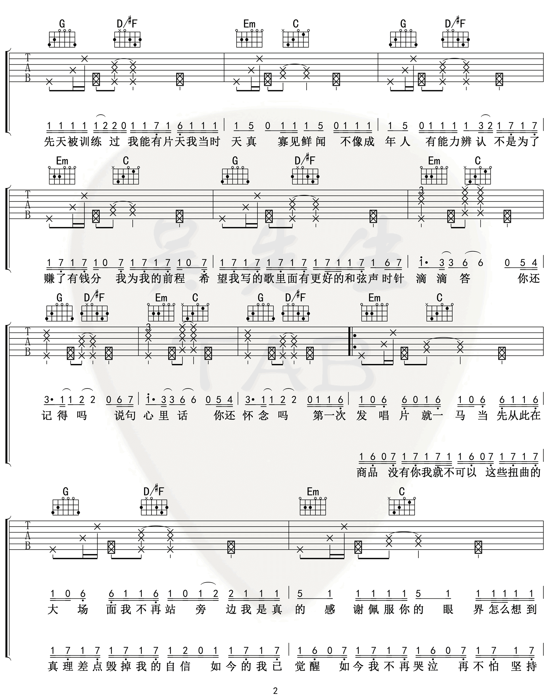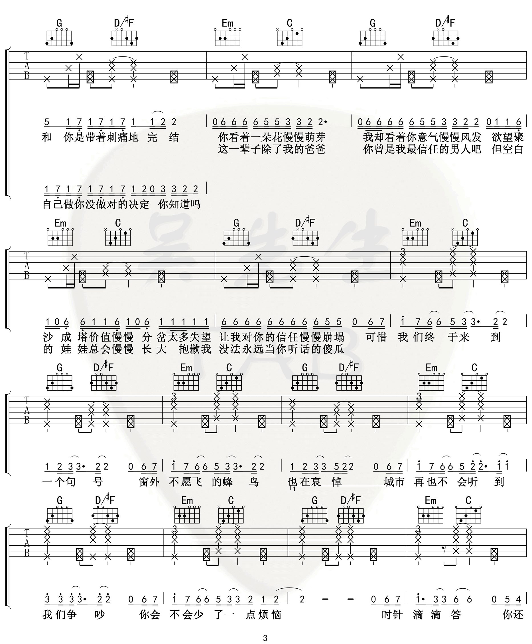 曲谱介绍: 句号吉他谱_邓紫棋_《句号》G调弹唱六线谱_高清图片谱分享,《句号》是由邓紫棋作词作曲并演唱的一首最新单曲。邓紫棋首次在音乐里坦然一切,因为唯有诚实面对过去,才有勇气大步迈向未来。邓紫棋表示所有想说的都写在这首歌里。 此版本的曲谱来源于吴先生扒谱制谱,歌曲原调为降B调,这里采用了C调指法根据原版进行编配,演唱时夹变调夹3品回到原调。这首歌编配难度不大,前奏也不难,后面加入了一些拍弦技巧,更增加了歌曲的律动感。 句号吉他谱_邓紫棋_《句号》G调弹唱六线谱_高清图片谱1-2: