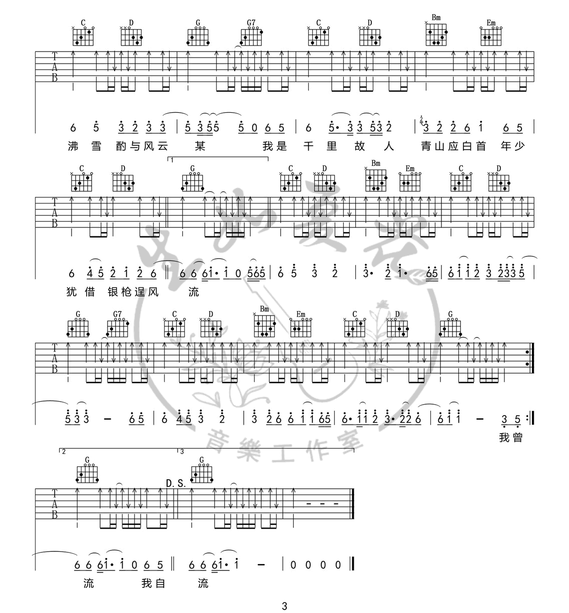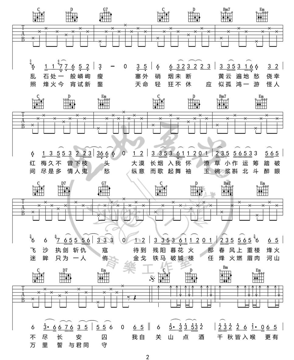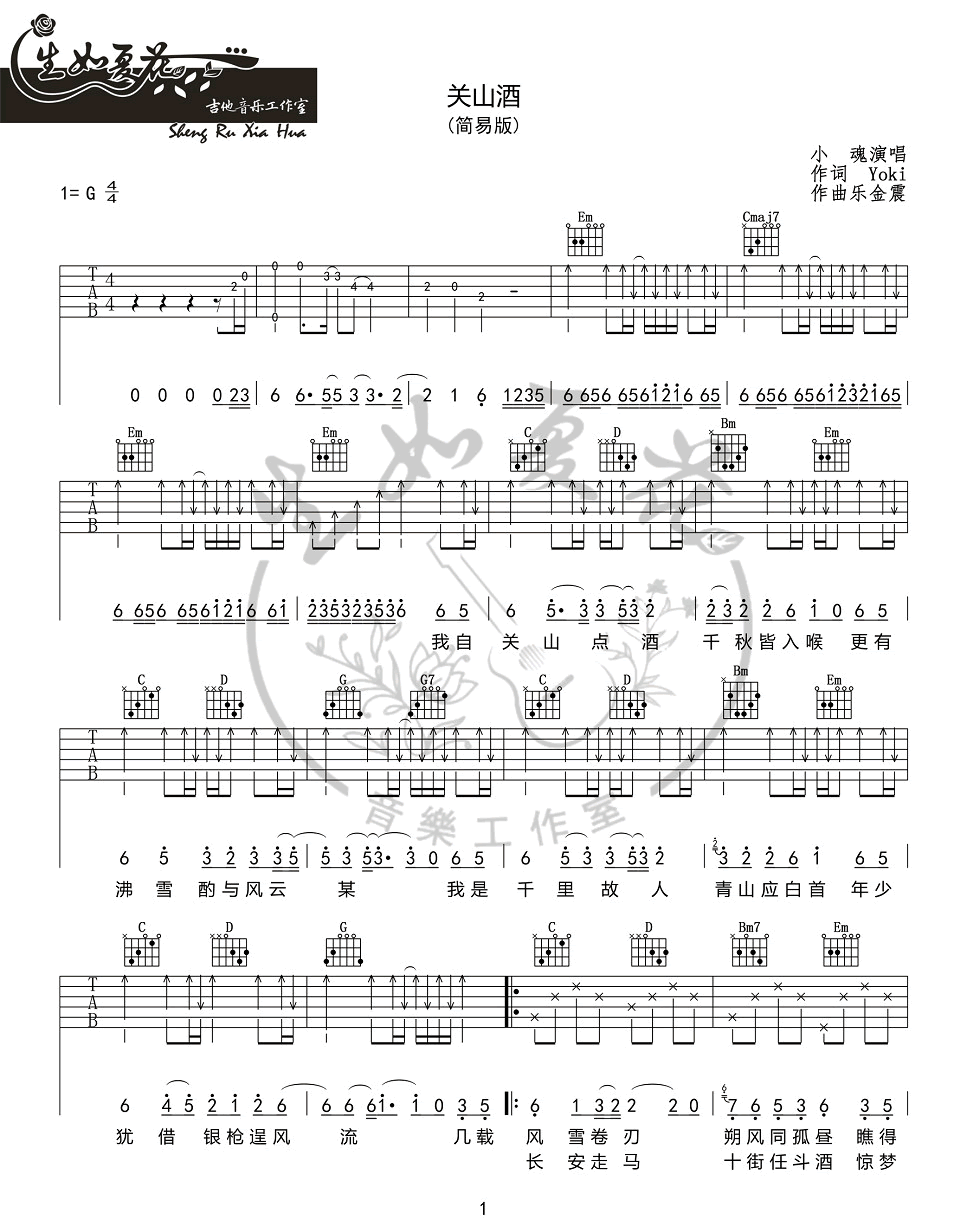 曲谱介绍: 关山酒吉他谱_小魂_《关山酒》G调简单版弹唱谱_高清六线谱分享,《关山酒》是由等什么君演唱的一首古风歌曲,最近由小魂翻唱的这首《关山酒》传唱度也比较高。小魂别具韵味的戏腔演绎《关山酒》, 那飘摇的江湖风雨,正穿过时光壁垒,与你谋面。 此版本的曲谱来源于生如夏花吉他音乐工作室扒谱制谱,这里歌曲采用了G调指法进行编配,演唱时可根据自己的嗓音情况夹变调夹。这首歌编配难度不大,使用的和弦及节奏型都十分简单,比较容易练习。 关山酒吉他谱_小魂_《关山酒》G调简单版弹唱谱_高清六线谱1: