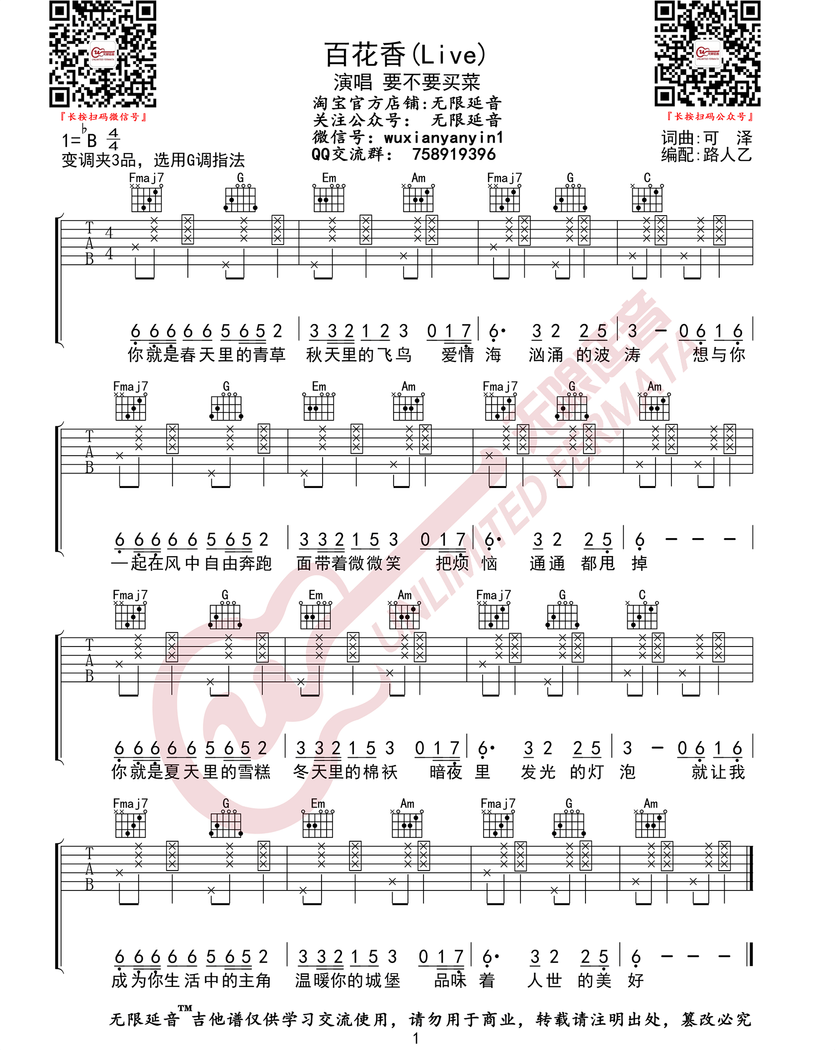曲谱介绍: 《百花香》吉他谱_要不要买菜_G调原版弹唱谱_高清六线谱分享,《百花香》这首歌原唱为魏新雨,最近网络上因为王小帅和要不要买菜的翻唱这首歌非常火,王小帅版本的谱子在本站分享过,这里分享的是要不要买菜翻唱的live版本。 此版本的曲谱来源于无限延音扒谱制谱,歌曲原调为降B调,这里采用了G调指法根据要不要买菜翻唱的live版本编配,比较简单,编配也十分简单,采用了拍弦的技巧进行弹奏,演唱时夹变调夹3品即可回到原调。 《百花香》吉他谱_要不要买菜_G调原版弹唱谱_高清六线谱: