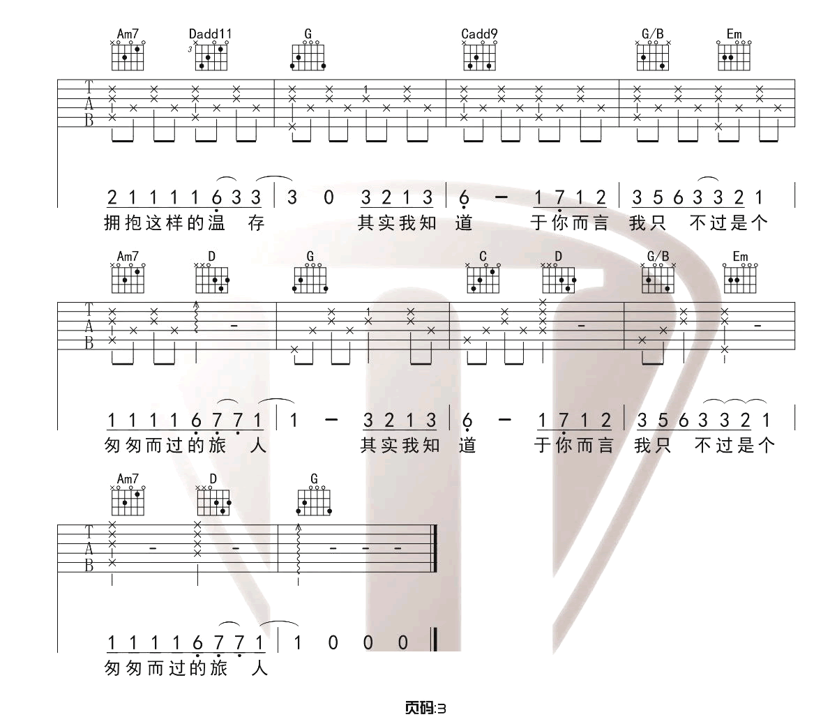 曲谱介绍: 《二零三》吉他谱_毛不易_G调原版六线谱_吉他弹唱教学分享,《二零三》是由毛不易演唱的一首歌。在这个时代,很多年轻人都在经历着从一个城市到另一个城市,从城市一端到另一端的漂泊。每一间小屋都承载着一段回忆,而对于那个屋子来说,人人都是过客。 此版本的曲谱及教学来源于山山吉他(原西二吉他)出品,这里采用了歌曲的原调G调指法根据原版进行编配,演唱时可根据自己的嗓音情况夹变调夹。曲谱编配指法难度也不大,如果有任何不懂的,可以参考吉他弹唱教学视频练习。 《二零三》吉他谱_毛不易_G调原版六线谱_吉他弹唱教学视频:   《二零三》吉他谱_毛不易_G调原版吉他弹唱六线谱_高清图片谱1: