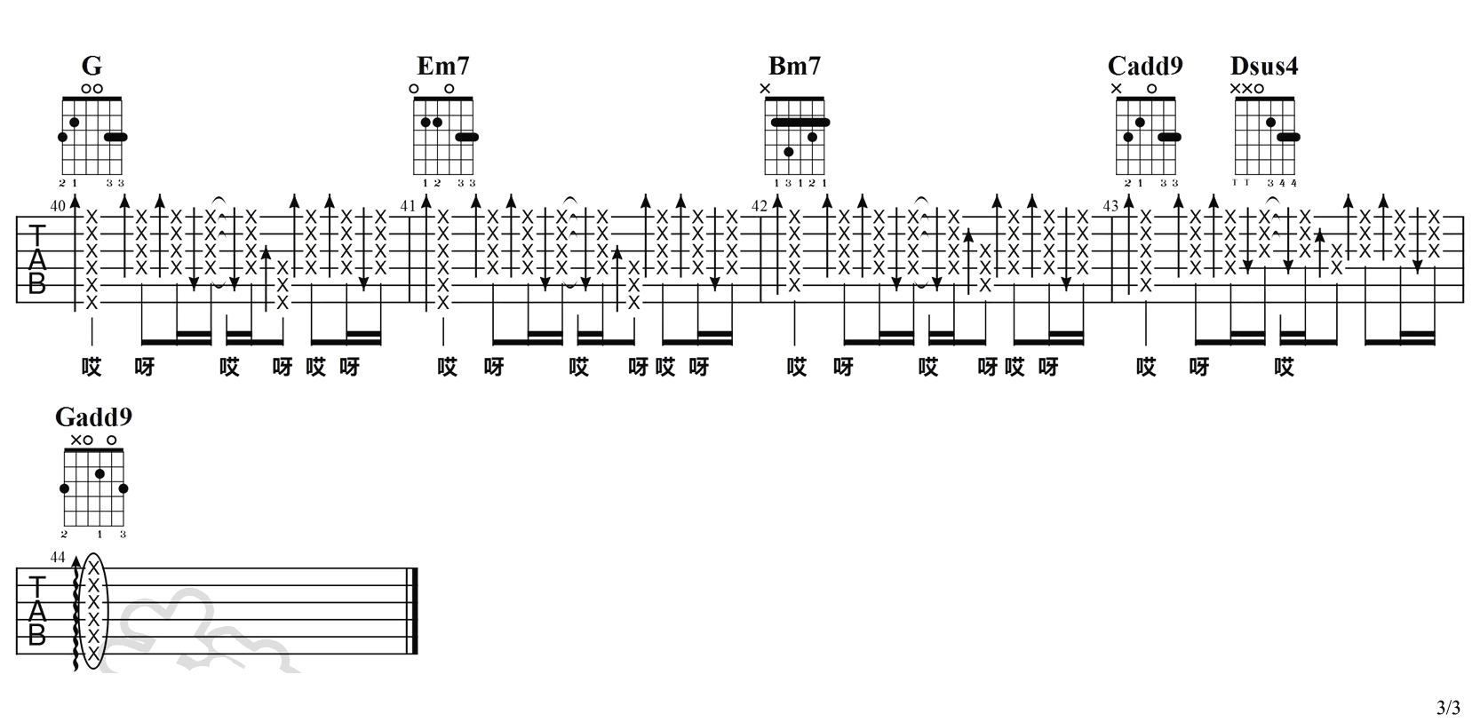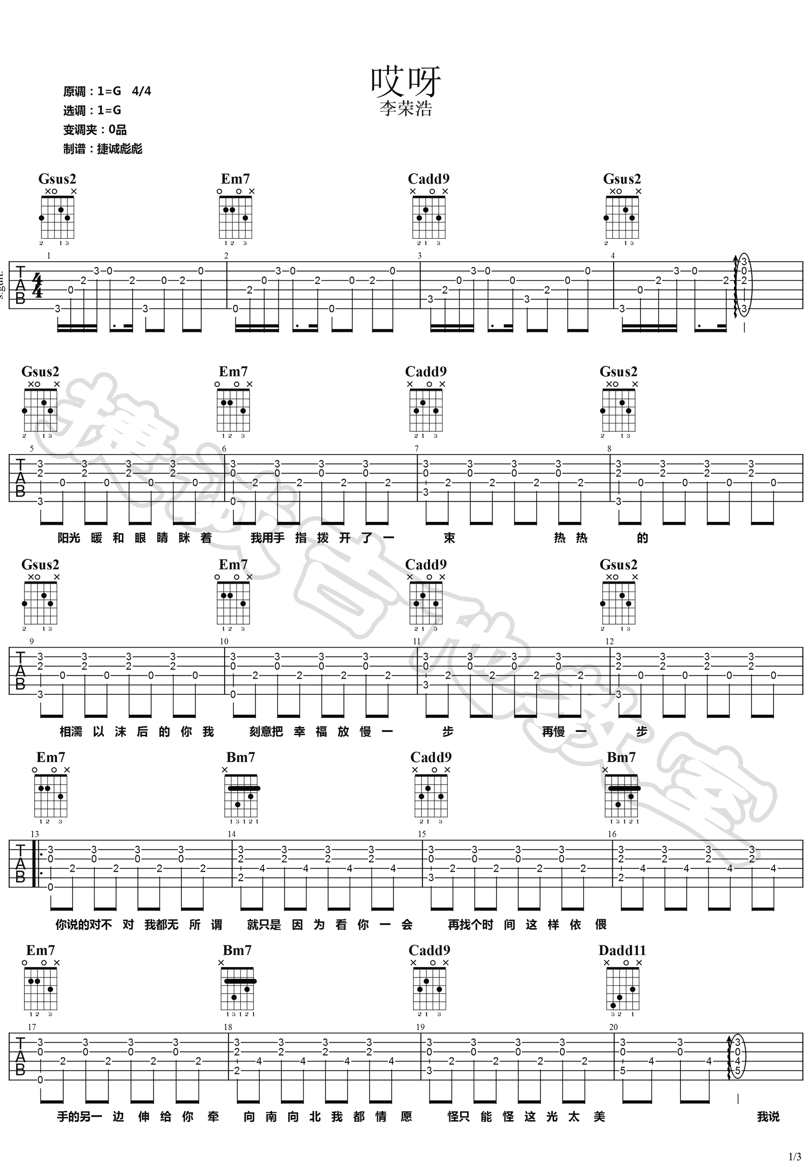 曲谱介绍: 哎呀吉他谱_李荣浩_《哎呀》G调原版六线谱_吉他弹唱教学分享,《哎呀》是由李荣浩作词作曲并演唱的一首歌。这是一首呢喃式的情歌,是一个男人和爱人愉快入睡之后醒来,沐浴早晨的阳光,并期望天天可以感受身边爱情的小情歌。 此版本的曲谱及教学来源于捷诚吉他教室出品,这里歌曲采用了G调指法根据原版进行编配,演唱时可根据自己的嗓音情况夹变调夹。这首歌编配难度不大,前奏部分带一些旋律音和附点节奏,后面的节奏型及和弦都十分简单,不懂的可以参考视频练习。 哎呀吉他谱_李荣浩_《哎呀》G调原版六线谱_吉他弹唱教学视频:   哎呀吉他谱_李荣浩_《哎呀》G调原版吉他弹唱六线谱_高清图片谱1: