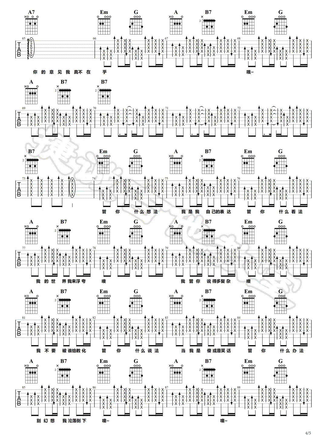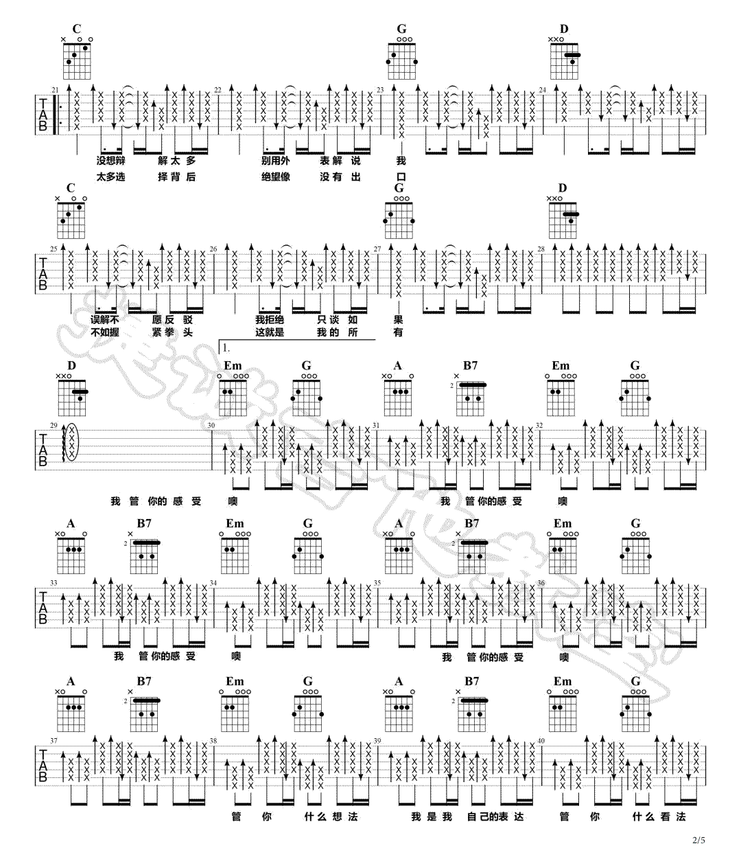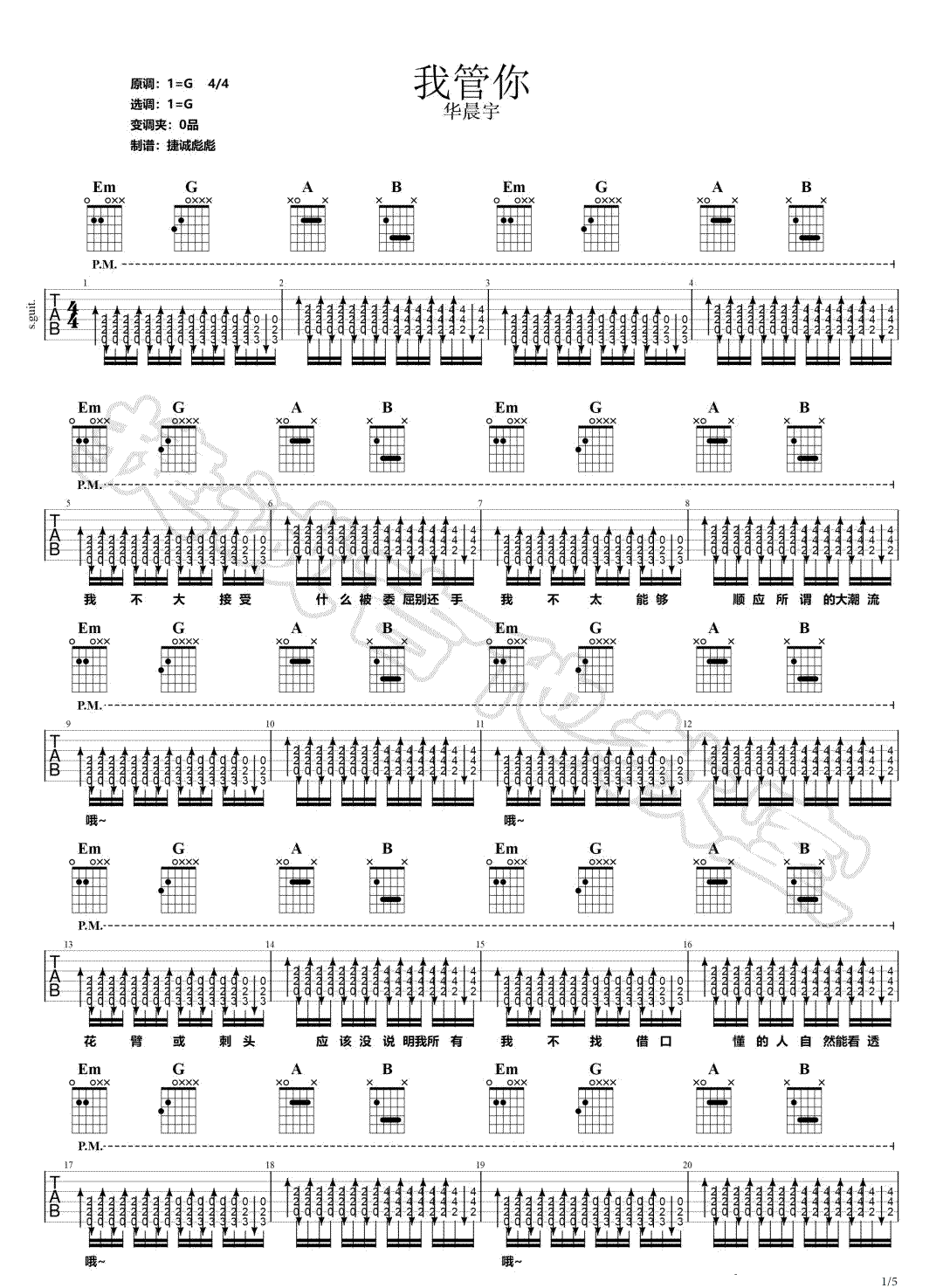 曲谱介绍: 我管你吉他谱_华晨宇_《我管你》G调弹唱六线谱_高清图片谱分享,《我管你》是由华晨宇演唱的一首歌,这首真的是很能彰显他的人物特征了。我管你什么想法,我有自己的表达,我的世界要你管?这首歌十分霸气地表现了我不需要你管的不羁,这正是华晨宇的个人魅力和独特之处。 此版本的曲谱来源于捷诚吉他教室扒谱制谱,这里采用了歌曲的原调G调指法根据进行编配,演唱时可根据个人的嗓音情况夹变调夹。这首歌编配难度不大,全曲都采用扫弦的形式编配,其中的B和弦及B7和弦比较难按,其他部分都十分简单。 我管你吉他谱_华晨宇_《我管你》G调弹唱六线谱_高清图片谱1-2: