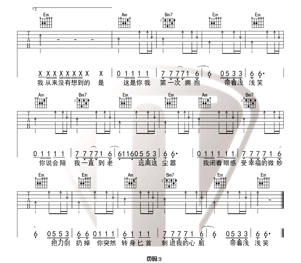 曲谱介绍: 内线吉他谱_许嵩_《内线》G调原版六线谱_吉他弹唱教学分享,《内线》是由许嵩创作演唱的一首歌,这首歌开始听应该不会有什么特别的感觉,但看了歌词以后却能通过歌词读出一个故事。看完听完后留下的只却有凄美。曲中的配音也映射出了这个故事的凄惨结局。 此版本的曲谱及教学来源于山山吉他(原西二吉他)出品,歌曲原调为A调,这里采用了G调指法根据原版进行编配,演唱时夹变调夹2品回到原调。曲谱编配难度不大,全曲除前奏外都是扫弦,其实主歌部分可改为分解和弦,可能会更加好听一些,有兴趣的可以试试看。 内线吉他谱_许嵩_《内线》G调原版六线谱_吉他弹唱教学视频:   内线吉他谱_许嵩_《内线》G调原版吉他弹唱六线谱_高清图片谱1: