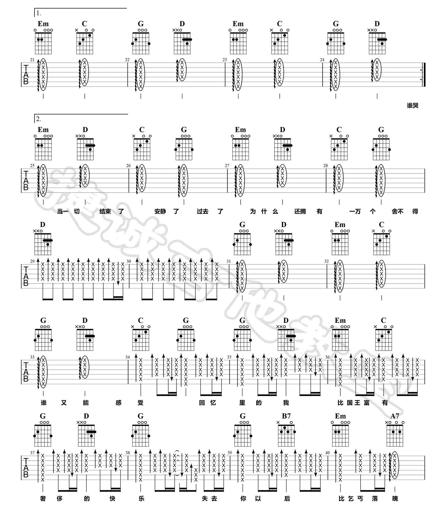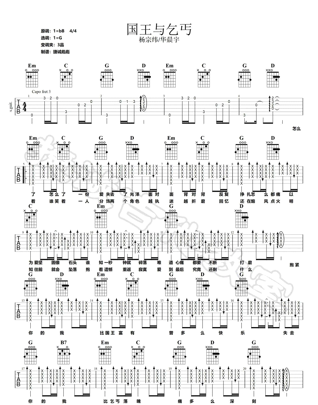 曲谱介绍: 《国王与乞丐》吉他谱_华晨宇/杨宗纬_G调弹唱谱_高清六线谱分享,《国王与乞丐》是由华晨宇和杨宗纬合唱的一首歌。华晨宇和杨宗纬演唱的《国王与乞丐》是一首好听伤感有真实的歌曲,拥有与失去之间的变换,角色就从得意者与失意者中切换。 此版本的曲谱来源于捷诚吉他教室扒谱制谱,歌曲原调为降B调,这里采用了G调指法根据原版进行编配,演唱时夹变调夹3品。这首歌编配难度不大,使用的和弦及节奏型都十分简单,但这首歌不太好唱,所以这首歌弹不是重点,唱才是重点。 《国王与乞丐》吉他谱_华晨宇/杨宗纬_G调弹唱谱_高清六线谱1: