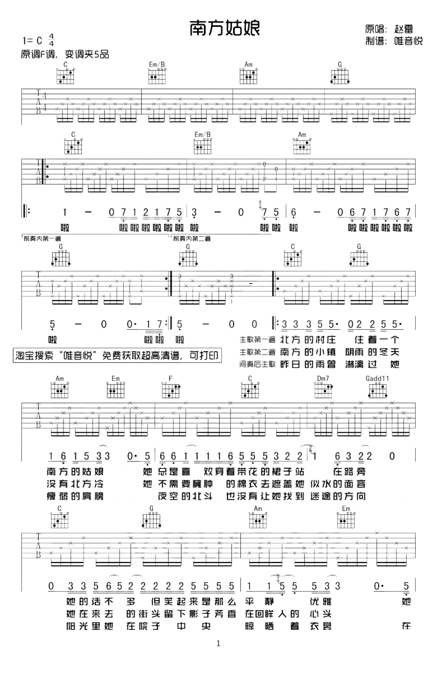 曲谱介绍: 《南方姑娘》吉他谱,C调简单版,变调夹夹第五品。赵雷演唱的经典民谣歌曲,一首有故事的歌,干净的吉他旋律,朴实的歌声,唱出我们心中的最温婉动人的姑娘。你的南方姑娘是谁?