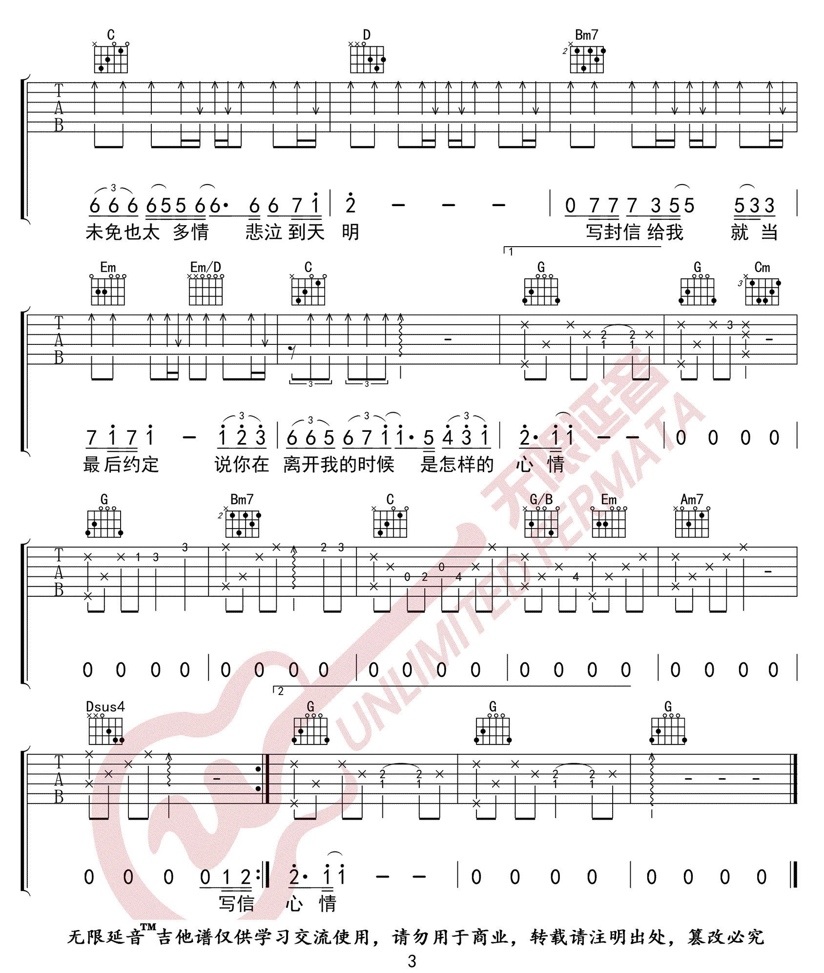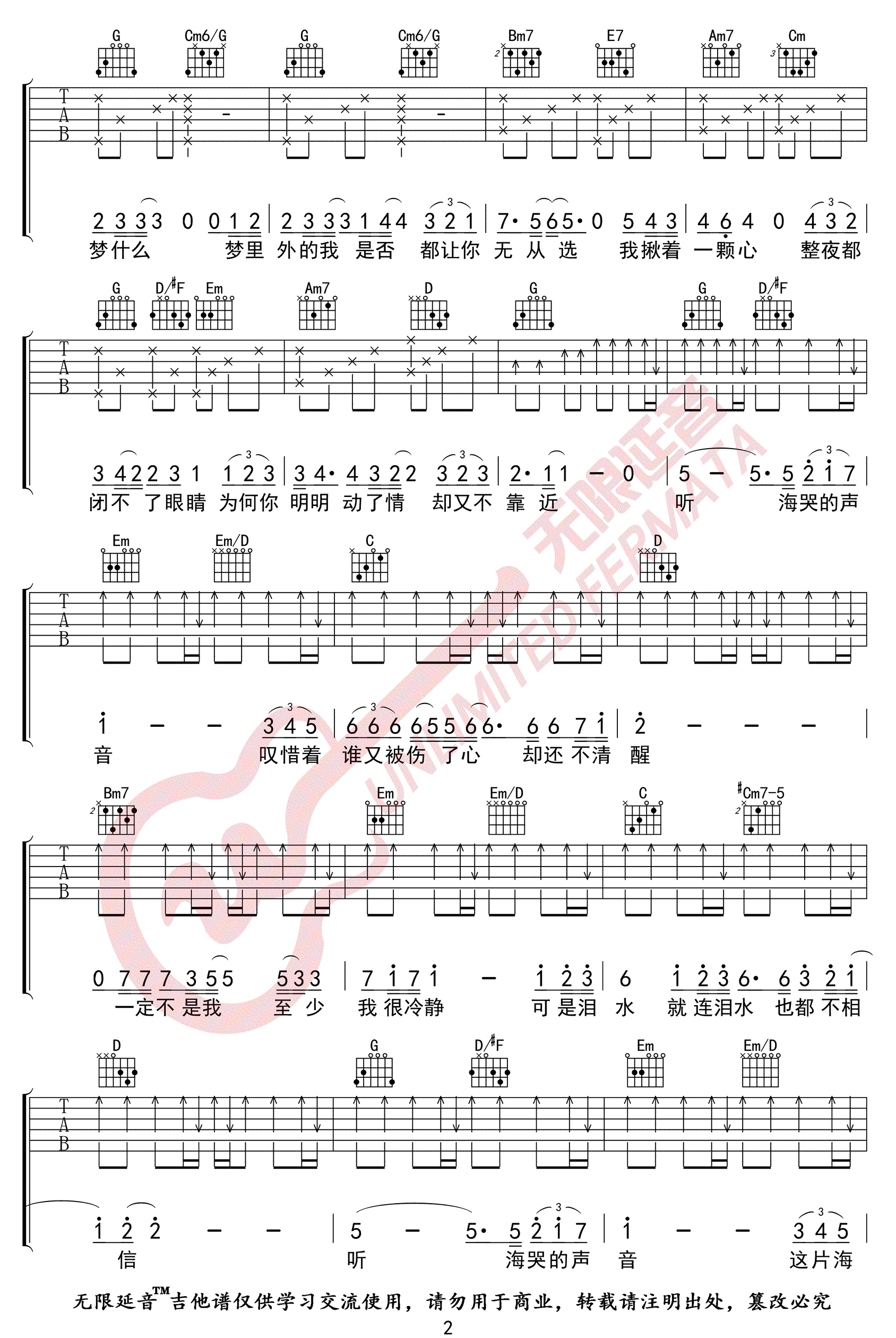 曲谱介绍: 听海吉他谱_张惠妹_《听海》G调原版弹唱谱六线谱_高清图片谱分享,这首歌来自于张惠妹演唱的《听海》,多年来打动了无数人,阿妹细腻的声音,给予了这首歌无限的高度,也被许多歌手频繁的翻唱,包括歌神张学友。歌中情绪跌宕起伏,如缠绵的蛛丝,被厚重的情感包围着。 此版本的曲谱来源于无限延音扒谱制谱,歌曲原调为降B调,这里采用了G调指法根据原版进行编配,演唱时夹变调夹3品回到原调。歌曲编配难度不大,前奏带有一些旋律音,后面使用的和弦及节奏型都十分简单。 听海吉他谱_张惠妹_《听海》G调原版弹唱谱六线谱_高清图片谱1: