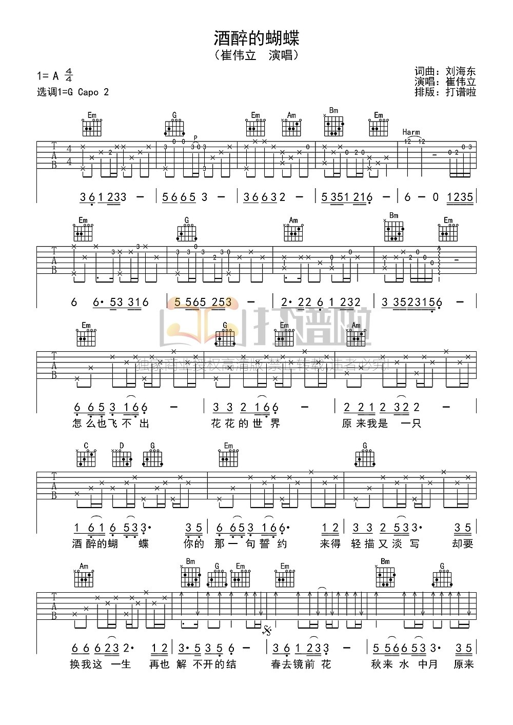 曲谱介绍: 崔伟立《酒醉的蝴蝶》吉他谱_G调弹唱六线谱_高清图片谱分享,《酒醉的蝴蝶》是由崔伟立演唱的一首网络热门歌曲,这首歌发行于去年8月份,时间并不长,但是这首歌非常洗脑,活遍了各种地方的大街小巷,不管是小破站还是某音,还是各种论坛,都遍布着各种各样的版本。 此版本的曲谱来源于打谱啦平台扒谱制谱,歌曲原调为A调,这里采用了G调指法根据原版进行编配,演唱时夹变调夹2品回到原调。这首歌编配有一定难度,主要在于前奏部分的节奏及技巧相对后面较为复杂,其他部分都十分简单。 崔伟立《酒醉的蝴蝶》吉他谱_G调弹唱六线谱_高清图片谱1: